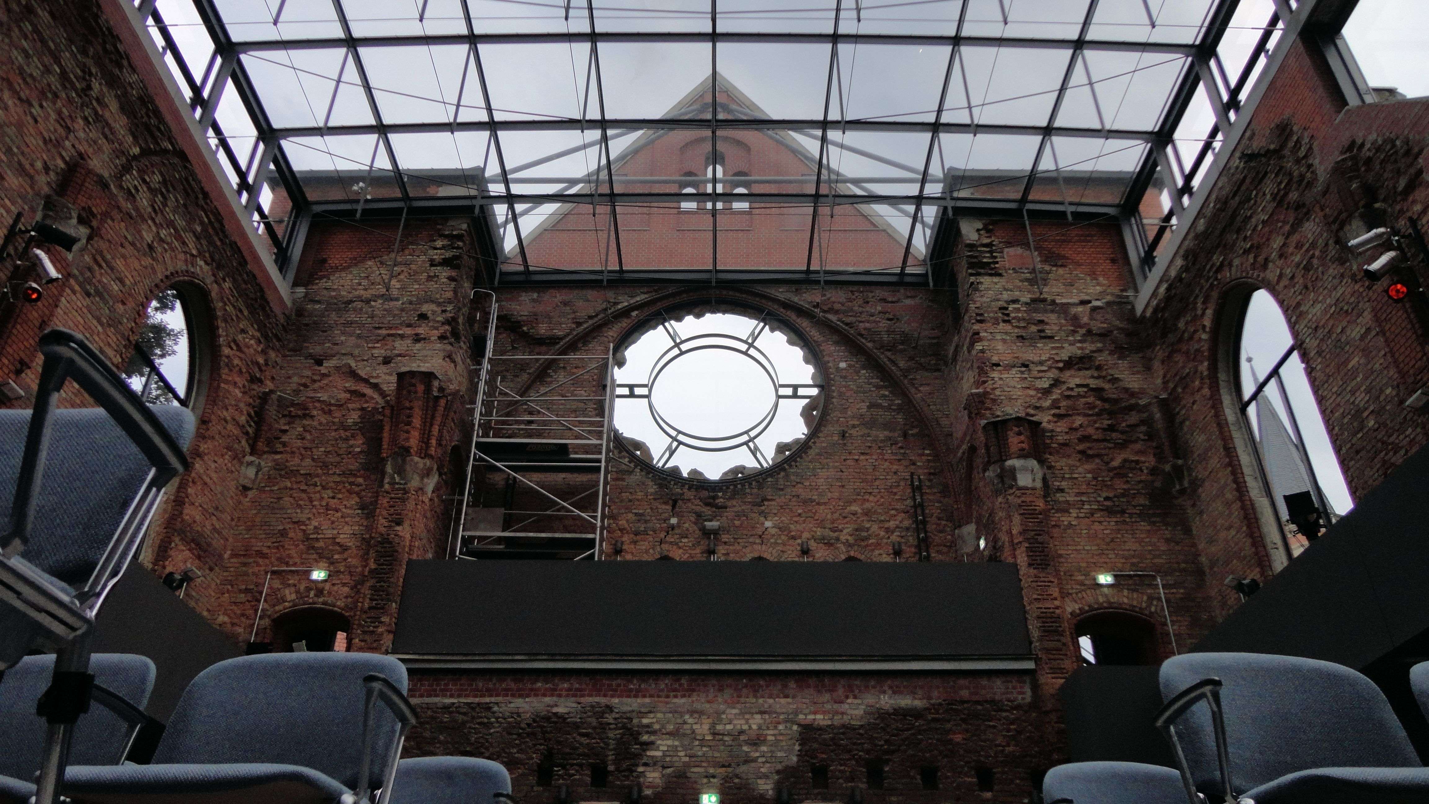 In der St.-Pauli-Ruine mitten im Hechtviertel wird Theater gespielt. Vor ein paar Jahren war ich schon mal hier, damals noch unter freiem Himmel. (Neustadt-Geflüster vom 1. Juli 2010 und Neustadt-Geflüster vom 9. August 2000) Inzwischen hat das Theater mit der gewaltigen Kulisse ein Glasdach bekommen. Prima so kann ich die Blitze und die Regentropfen sehen, werde jedoch kein bisschen nass. Die Atmosphäre ist dennoch atemberaubend und ein bisschen verrückt zugleich. Wo steht schon die Bar mitten im Theaterraum? Welche Bühne reicht schon über drei Etagen?