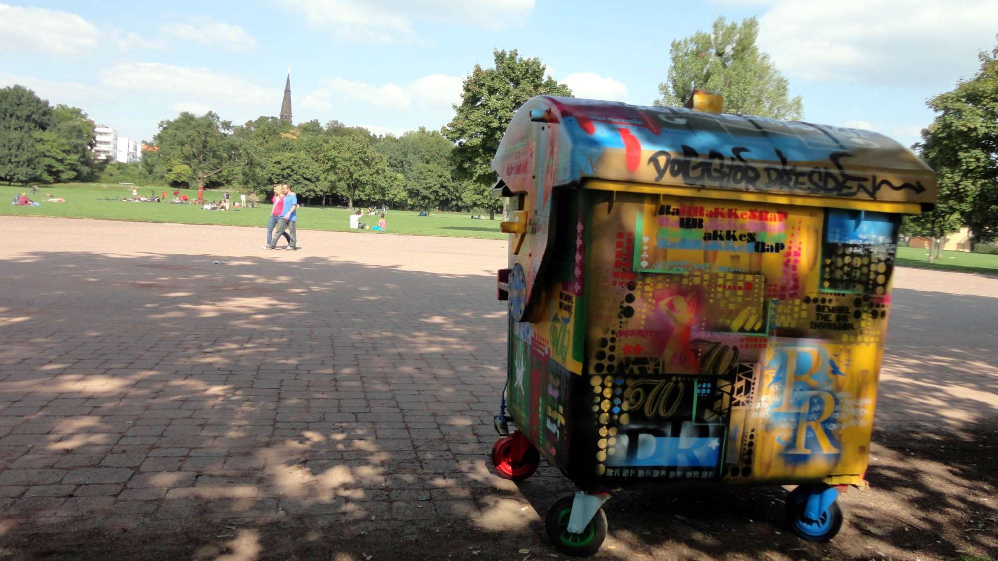 Seit Sonnabend stehen an der Nordseite der Wochenmarktfläche zwei große Restabfallbehälter, die von Graffiti-Künstlern gestaltet wurden. Sie sind zwar nicht so schön historisierend wie die Blechtonnen des Naußlitzer Kulturvereins, dafür passt aber eine Menge rein. (Vergleiche Neustadt-Geflüster vom 18. April)