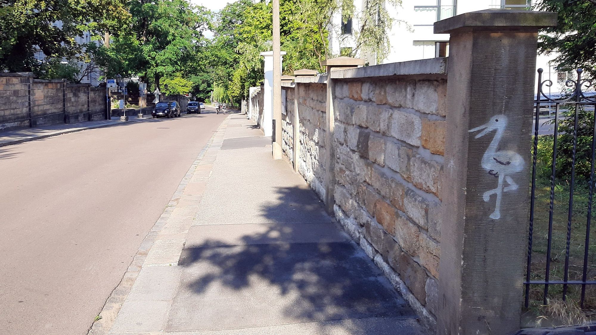 Aber auch ein unpolitisches Motiv in der nahen Holzhofgasse hält sich seit Jahrzehnten – ein Storch an einer Säule. Neustadt-Geflüster-Leser Torsten (Name geändert), der dieser Tage zu einer Silberhochzeit eingeladen ist, berichtet. „Beim Radeln in der Lausitz habe ich gesehen, dass es dort die Tradition, anlässlich einer Hochzeit Störche auf die Straße zu malen immer noch gibt. Daher habe ich mich erinnert, dass ich von ziemlich genau 25 Jahren das letzte Mal selbst Störche auf Wände und Straßen gepinselt habe.“