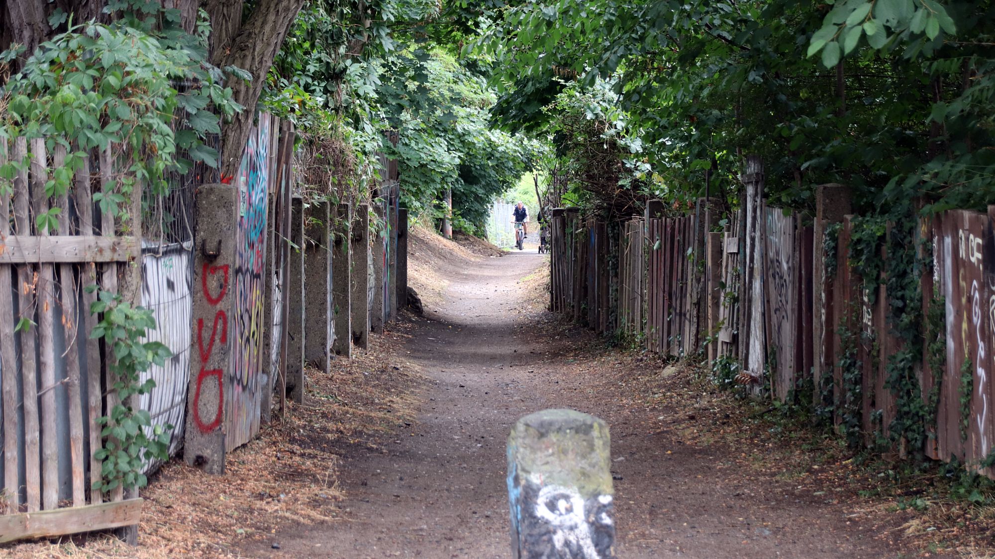Es geht um den Dammweg. Der beginnt an der Stauffenbergallee als schmaler Pfad, wird ab der Lärchenstraße zur Straße und endet dann an der Lößnitzstraße. Laut dem Antrag soll der Weg für den Radverkehr ertüchtigt werden. Das ist zwar jetzt schon möglich, aber gerade bei schlechtem Wetter im nördlichen Bereich eine ziemliche Schlammschlacht.