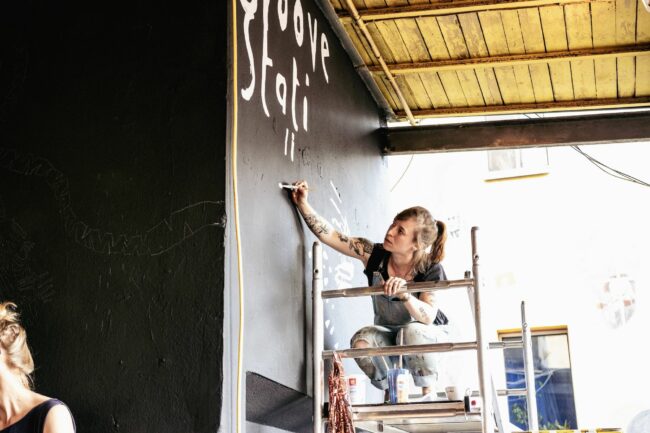 Graue Wolken hängen über dem Gelände der Groovestation, auch die bemalten Hauswände schauen blass drein. Ganz hinten in der Ecke jedoch entsteht gerade ganz frische Kunst: Anett Bauer, auch bekannt als Muah, bemalt die neue Photobox. Während sich auf dem schwarzen Untergrund immer mehr weiße Striche zueinander gesellen, erzählt sie mir von ihrem Leben als Künstlerin.