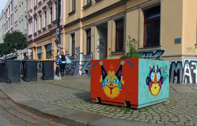 Wiederzuerkennen sind ihre Designs nicht nur auf T-Shirts, sondern auch beim Schlendern durch Neustadt und Hecht. Zum Beispiel hat Anett den S-Bahnhof Bischofsweg mitgestaltet und einen der Kübel auf der Hechtstraße besprüht. Und auch im Hof der Groovestation hat sie längst ihre Spuren hinterlassen.