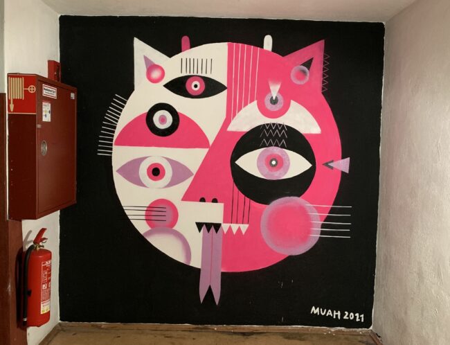 Neben den Strichen auf der Photobox entsteht jetzt eine Zickzack-Linie. Abwechslung muss ja auch mal sein. Obwohl Muah davon sowieso jede Menge hat. Neben der eigenen Kunst gibt sie hin und wieder Workshops. Ganz selten, zum Beispiel als Teil des Kollektivs Distilled & Bottled, sogar mal ein Live painting – „obwohl ich eigentlich gar nicht gern auf der Bühne oder im Mittelpunkt stehe“. Die Aufmerksamkeit überlässt sie dann doch lieber ihren Werken statt ihrer Person. Und die machen ihre Sache echt gut.