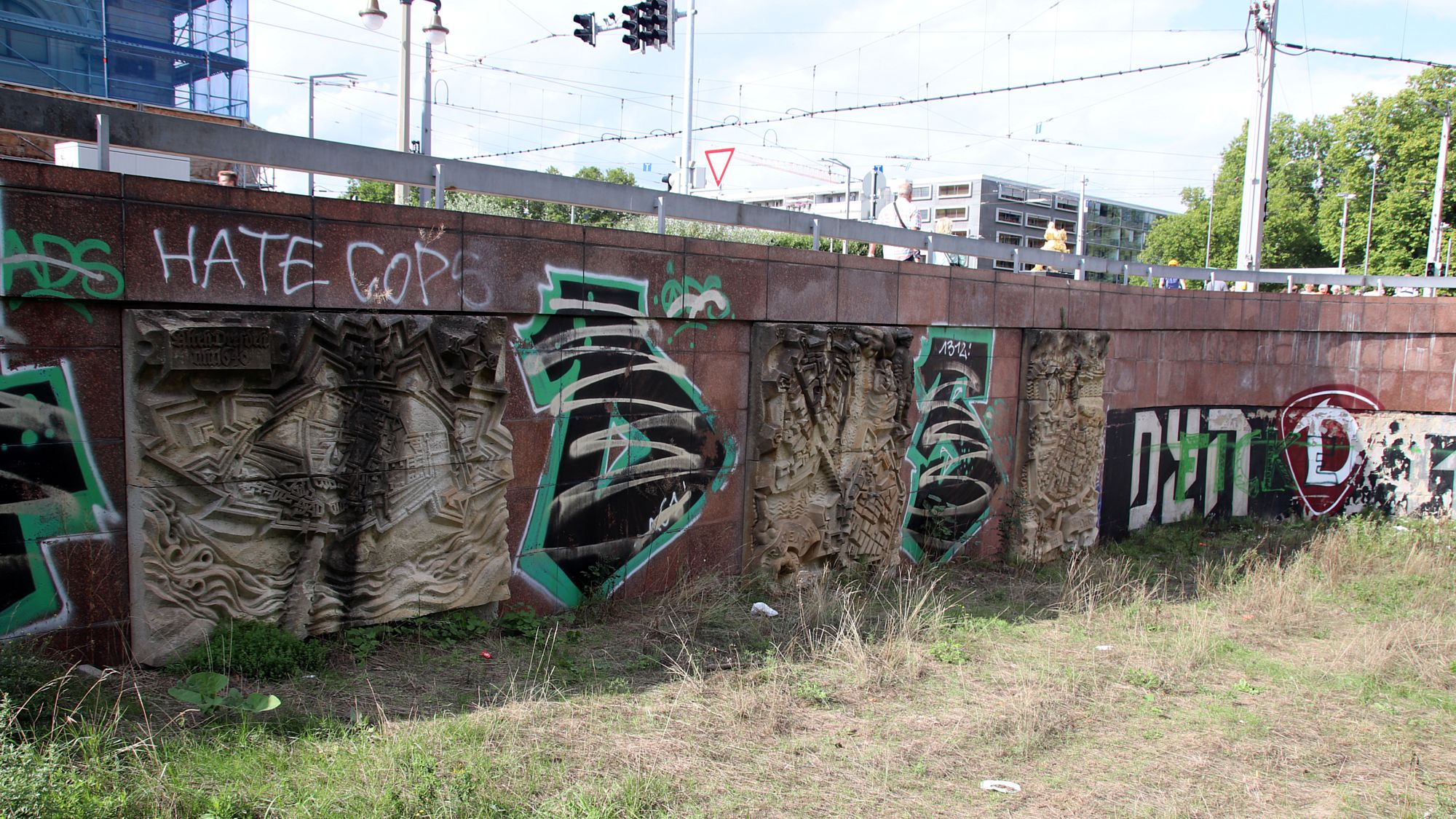 Nun wird es tricky. Der Weg scheint in einer Mauer zu enden. Vor Jahren wurde hier ein Tunnel zugebuddelt. Das verwilderte Gelände lässt man hinter sich, um die Rampe rauf zur Brücke zu nehmen.