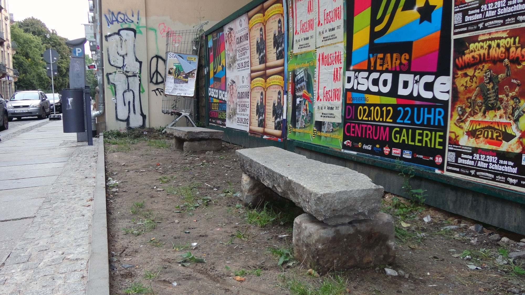 In der Bau- und Werbeflächenlücke am Grundstück Alaunstraße 92 haben Unbekannte eine neue Sitzgelegenheit geschaffen. Aus ehemaligen Fußwegplatten wurden hier stabile Bänke hingestellt. Die Fläche wird schon seit einer kleinen Ewigkeit von einem riesigen Einkaufswagen verziert. Damit man sich auch gemütlich hinsetzen kann und nicht von eventuell hingepinkeltem Urin stören lassen muss, haben die Objektkünstler hinter der Plakatwand eine provisorische Toilette geschaffen. Die Funktionalität konnte am heutigen Morgen aufgrund geringen Harndrangs nicht getestet werden.