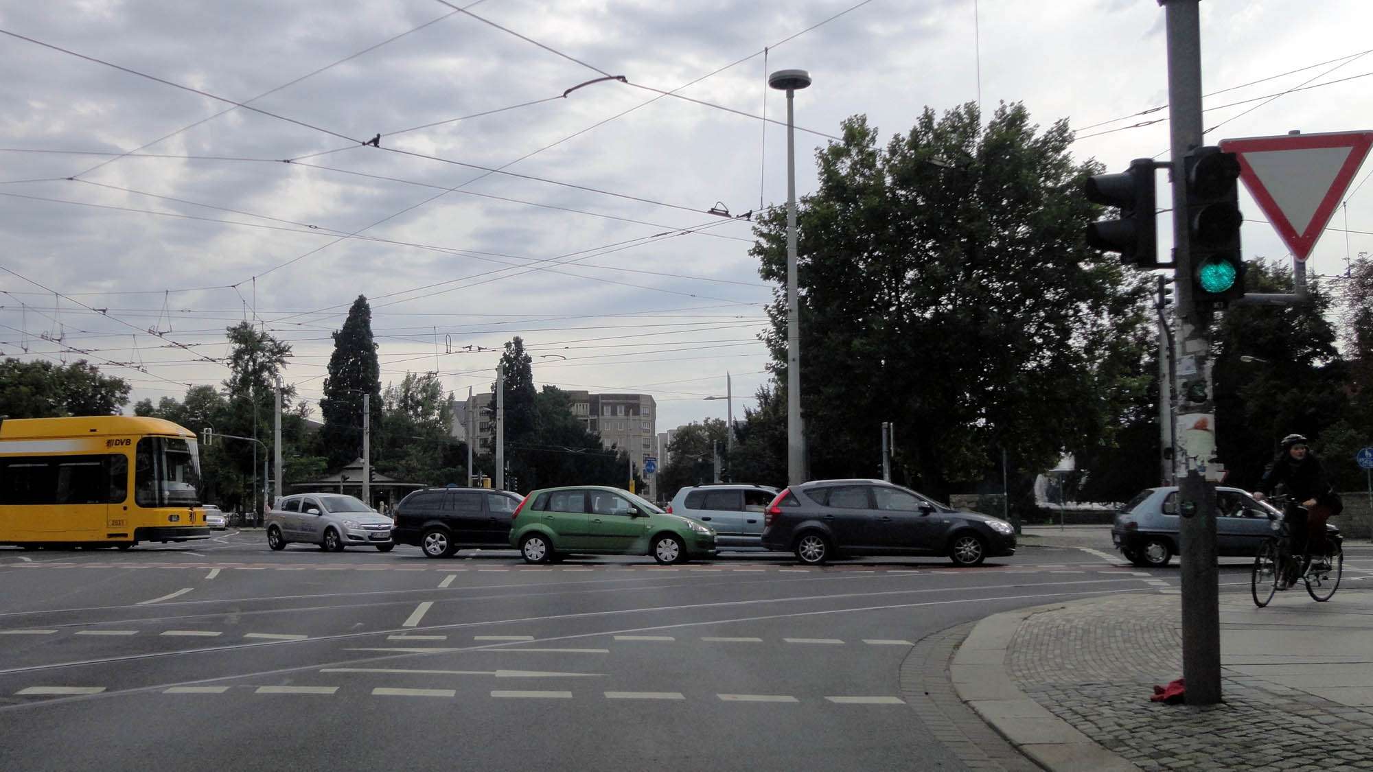 Diese Linksabbiegerspur (Albertstrasse -> Antonstraße richtung Bhf Neustadt) ist IMHO ohnehin eine Katastrophe. Ich habe dort schon viele Beinahe-Auffahrunfälle gesehen weil ortsunkundige Autofahrer beim Anblick der – mitabbiegenden – Tram im Rückspiegel panisch in die Eisen gegangen sind.