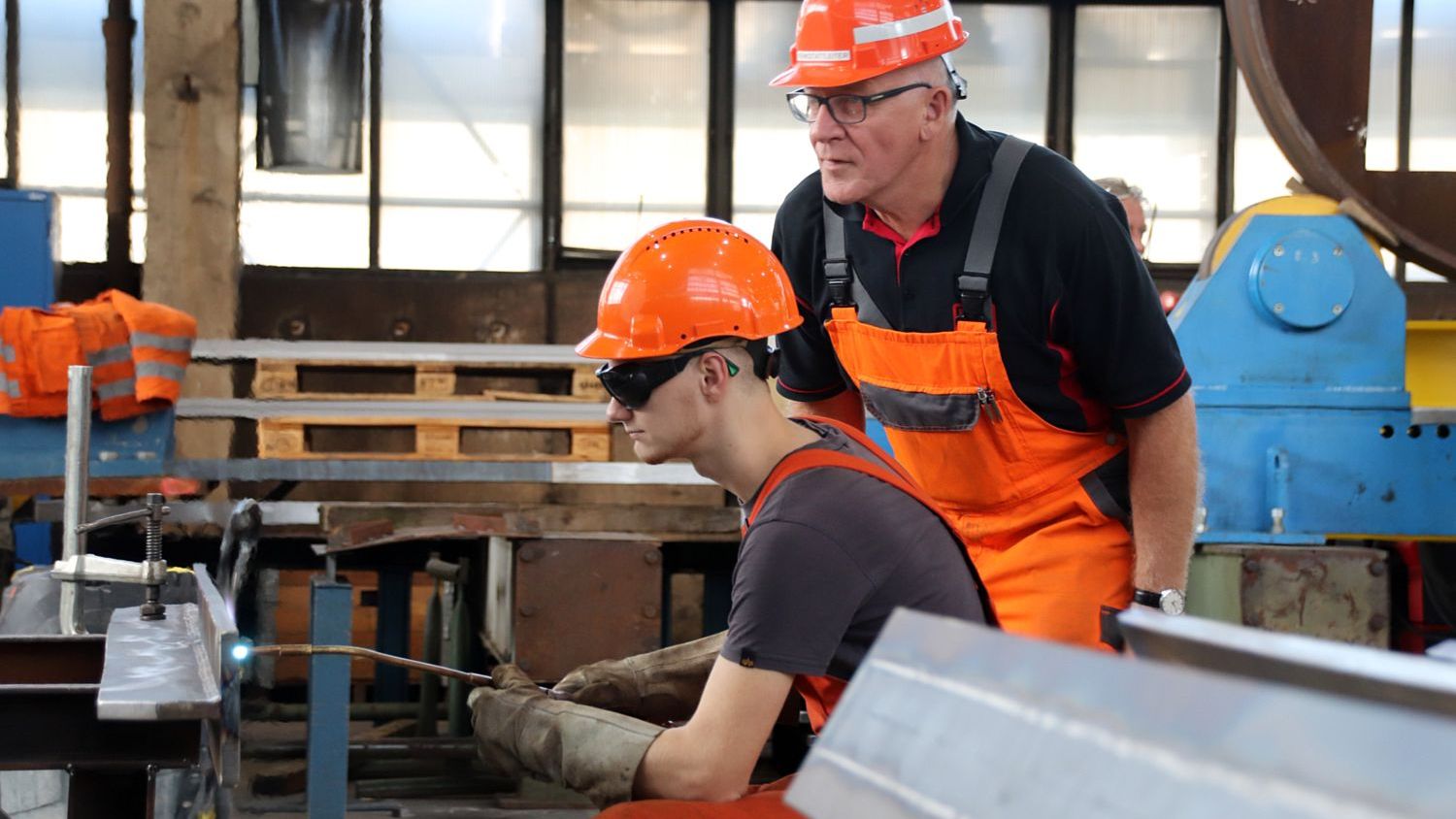 „Hier sehen Sie den Schweißautomaten“, erläutert er und beginnt eine längere Erklärung der Funktionsweise. Die Begeisterung fliegt nur so aus seiner Stimme. Begeistert ist auch Max Andermann, mit 20 Jahren einer der jüngsten der insgesamt rund 90 Mitarbeiter*innen hier in der Werkstatt. Genau wie Uwe Träber, den hier alle nur Hugo nennen, hat auch Max hier gelernt und ist nun Konstruktionsmechaniker Stahlbau. „Hauptsächlich schweißen“, beschreibt er seine Arbeit und demonstriert an einem Träger, wie sein Alltagsgeschäft abläuft. Hugo, der Werkstattleiter, guckt kurz hin und ist zufrieden. „Der macht das schon gut.“