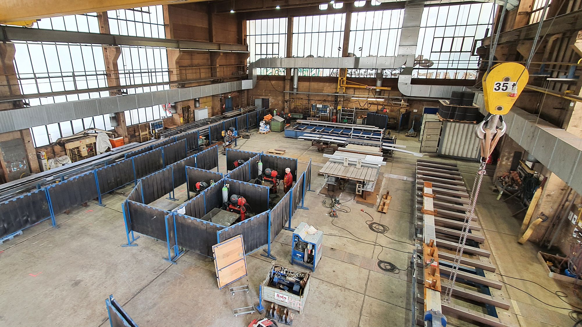 Vor allem Eisenbahnbrücken aus Stahl werden hier hergestellt oder auf Vordermann gebracht. Dafür stehen zwei Werkhallen bereit: Während in der ersten Stahl geschnitten, gebohrt und gehobelt wird, steht in der zweiten die Voll- bzw. Teilfertigung auf dem Plan. Außerdem werden die Teile in einer eigenen Korrosionsschutzanlage gestrahlt und beschichtet, die eingangs erwähnte Männerwaschmaschine.