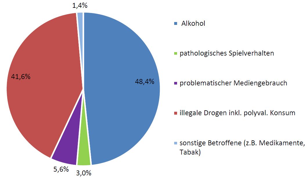 Zur Einordnung dieser Entwicklung bleibt dennoch weiter festzuhalten, dass Probleme aufgrund von Alkoholkonsum nach wie vor seit Jahren in der ambulanten und in der stationären Suchthilfe dominieren. Der Anteil der Beratungssuchenden zum Thema Alkohol entwickelte sich von 49,4 Prozent im Jahre 2017 auf 48,4 Prozent im Jahre 2021 und hat sich demnach kaum verringert.