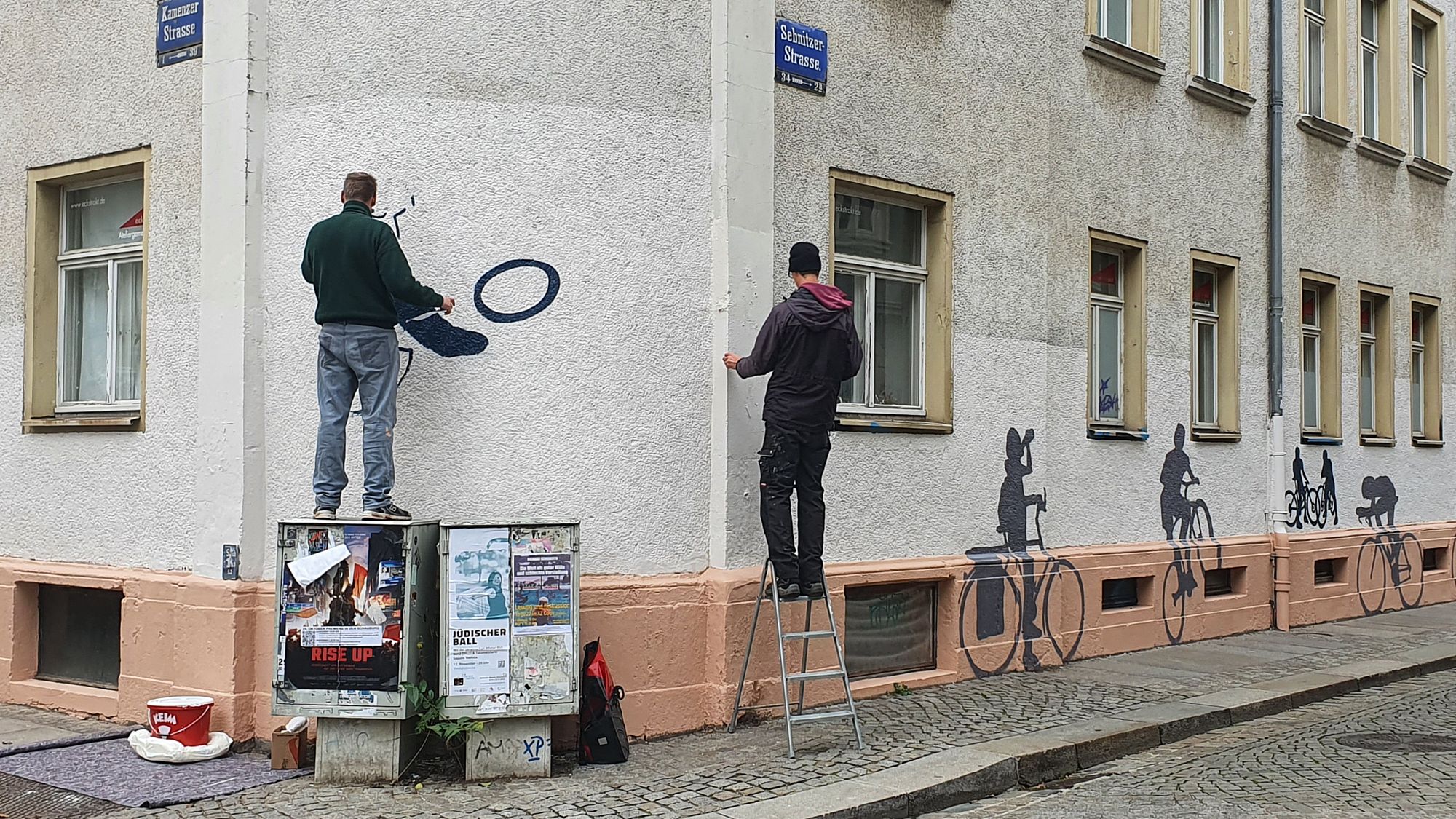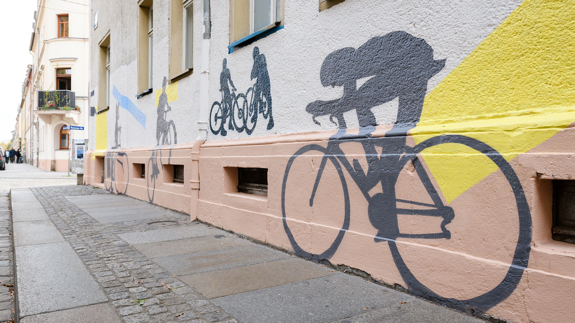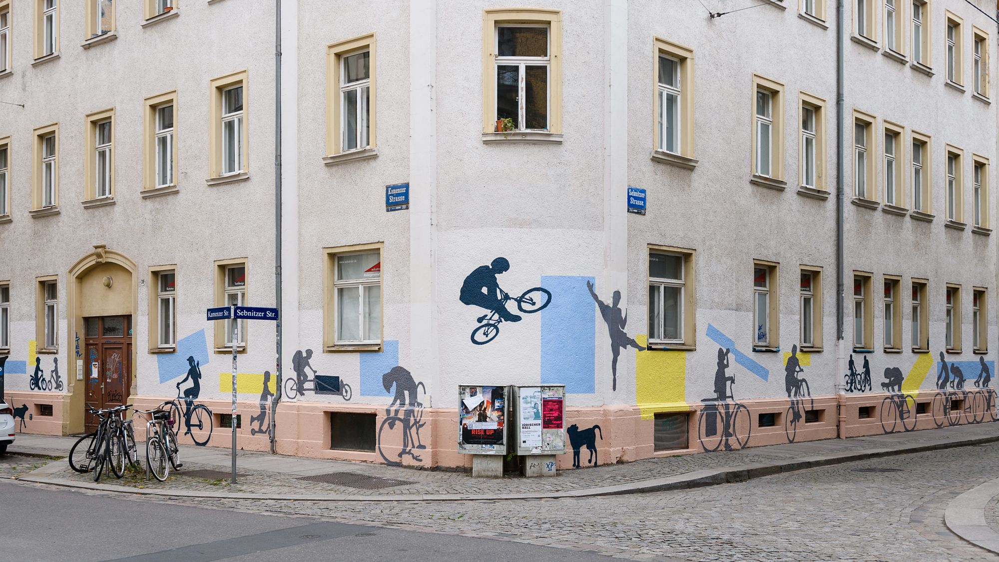 In der vergangenen Woche ist an der Kamenzer, Ecke Sebnitzer Straße die Fassade neu gestaltet worden. Der Hauseigentümer, die Vonovia, hat einen Dresdner Künstler beauftragt, die Ecke neu zu gestalten. Nun zieren eine ganze Reihe an Radfahrern die Hauswand. Auch spielende Kids und Hunde sind zu sehen.