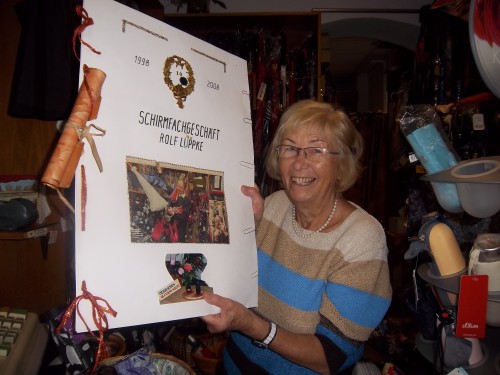Lieselotte Hoffmann („Mit doppeltem F!“), Schirmmachermeisterin, Besitzerin von mindestens einem Dutzend Schirmen und Schönwetter-Verächterin, steht fast täglich in dem Geschäft. Die Voraussetzungen zur Schirmherstellung sind zwar gegeben, aber heute lebt das Lädchen von Reparaturen und (Online-)Verkauf. Hoffmanns Augen blitzen, wenn sie die mannigfachen Formen und Sorten von Schirmen erklärt. Mit Schwung lässt sie einen nach dem anderen auseinanderklappen, erklärt Muster und Funktionen – ja, sogar Taschenlampenschirme gibt es nämlich. Das alles müsste man zu schätzen wissen, sagt sie, gibt es doch so viel Billigkram zu kaufen. Schirme, die niemand reparieren lassen will, weil ein neuer weniger kostet.
