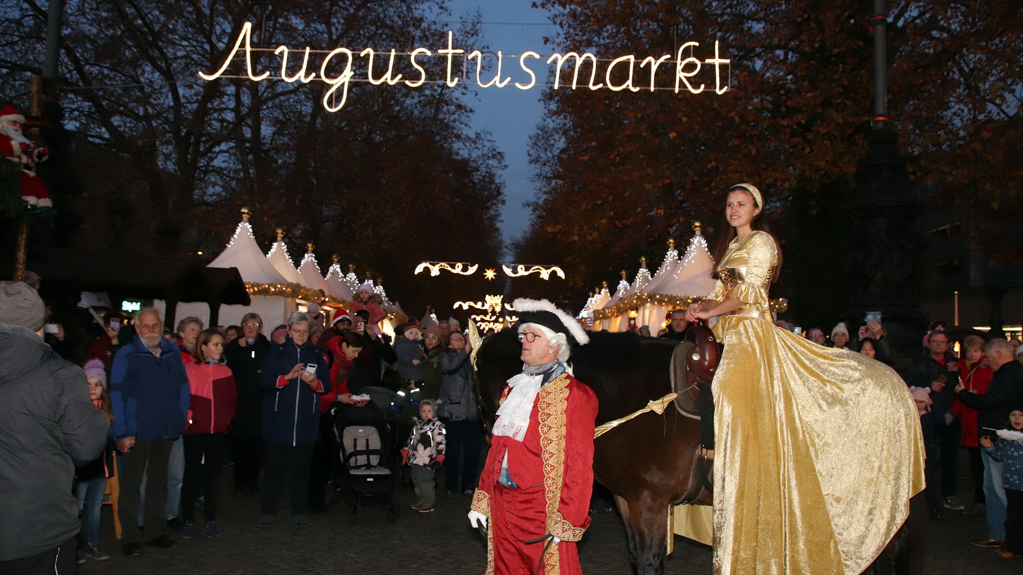 Heute Nachmittag ist mit einem Spielmannszug und einer Goldenen Reiterin der Dresdner Augustusmarkt auf der Hauptstraße eröffnet worden.