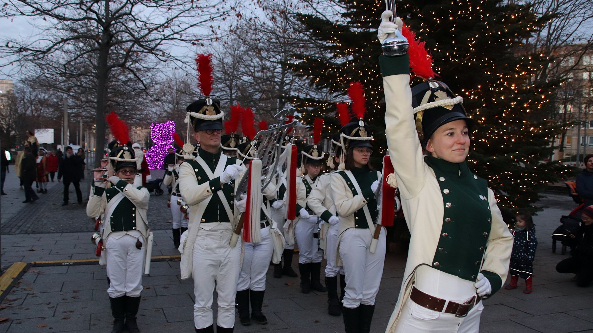 Attraktionen sind der berühmte Blaue Baum, das Riesenrad auf dem Neustädter Markt, die goldene Glitzertanne am Jorge-Gomondai-Platz, eine erzgebirgische Weihnachtspyramide und kuschelige Weihnachtsstuben.