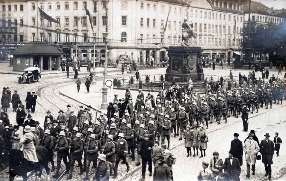 Der Erste Weltkrieg forderte Millionen Tote, Hunger, Zerstörung, viel Leid und Elend. Die Unruhen setzten sich in ganz Deutschland fort. Die katastrophale Versorgungslage führte allerorts zu Protesten, so auch in Dresden am Goldenen Reiter.