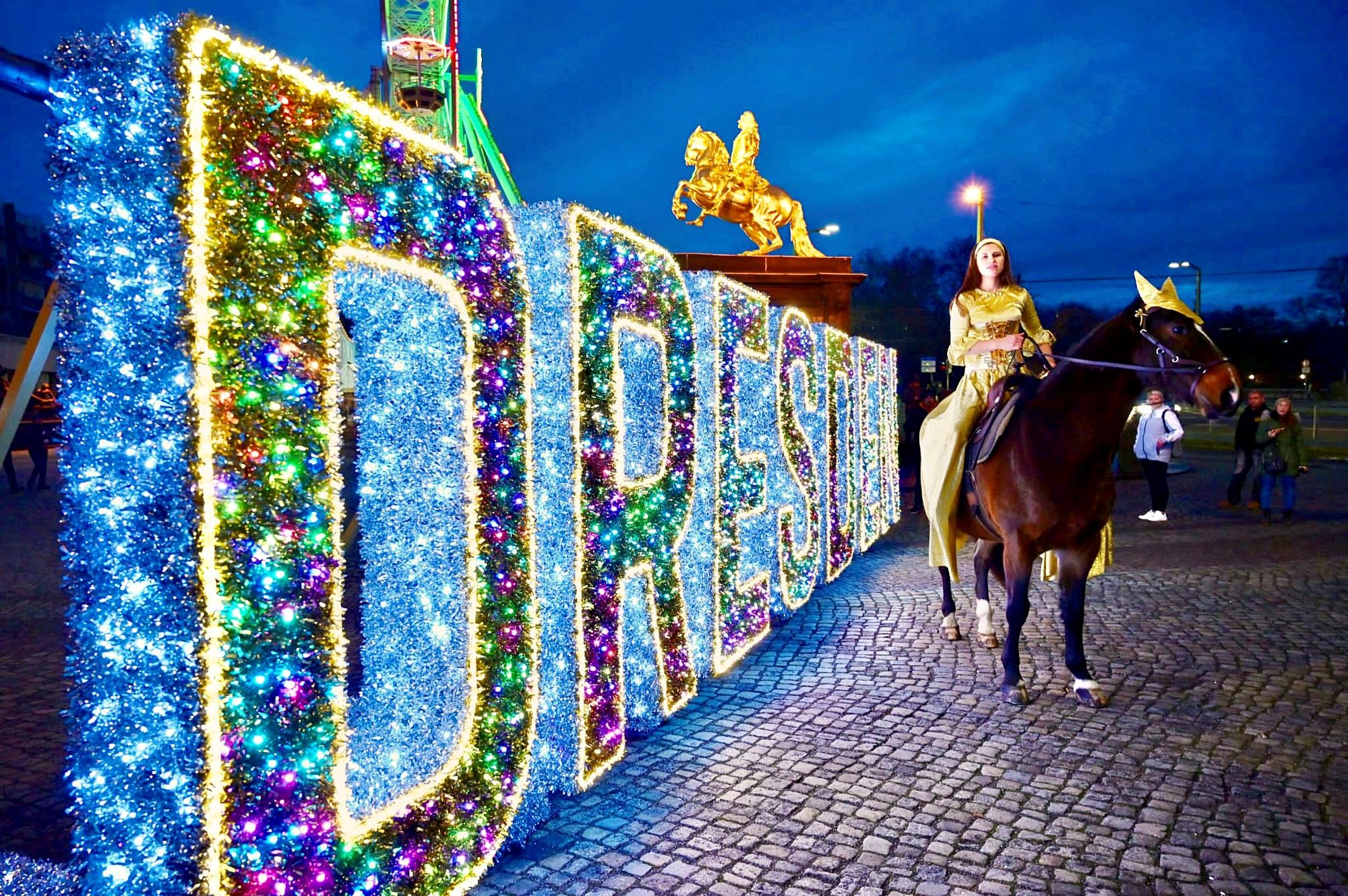 Dies war ein schöner „Hingucker“. Der Goldener Reiter neben dem beleuchteten Riesenrad & Dresden-Schriftzug.