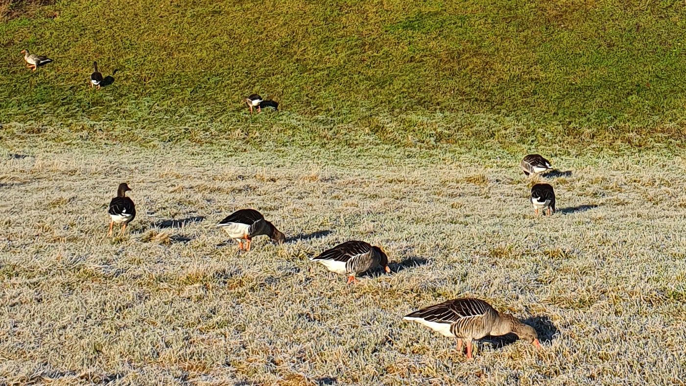 Entlang der Elbe überwintern in Dresden ebenfalls Graugänse, derzeit mindestens 100 auf den zentralen Elbwiesen. Keine Ahnung, wohin sie flüchten werden. Bereits die unentwegten Störungen durch frei laufende Hunde bergen ein ständiges Stresspotenzial. Hastig fressend, kaum Möglichkeiten zum Ruhen, um die geringe Energie des Grünfutters zu nutzen, stiebt die Schar bald wieder auseinander und dem Wasser zu, wenn ein sportlicher Vierbeiner angeflitzt kommt. Und das oft mehrmals stündlich.