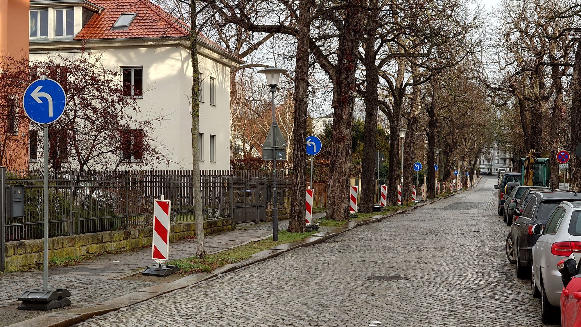 Während der Bauzeit ist die Fahrbahn halbseitig gesperrt. Wie die Stadt mitteilt, wird ab dem Bischofsweg eine Einbahnregelung in Richtung Nordstraße eingeführt. In dem ganzen Bereich ist dann Halteverbot. Und damit auch kein Anwohner falsch auf die Straße fährt bekommt jede Ausfahrt ein schickes blaues Schild. Die stehen jetzt schon bereit und werden dann am Montagmorgen entsprechend positioniert.