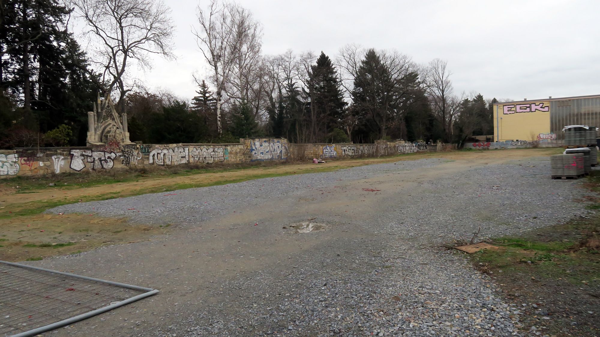 Auf dem Flurstück 1582/18 neben dem Inneren Neustädter Friedhof befanden sich bis vor ein paar Jahren ein Zentrum der Kreativwirtschaft. Allerdings wurden im Rahmen des Neubaus der Schule und des benachbarten Kindergartens auf dem Gelände mehrere Teergruben gefunden, die einen Erhalt der Häuser unmöglich machten. Seitdem Abriss liegt die Fläche brach. Die Sachsen-Energie hatte dann Pläne veröffentlicht, auf der Fläche einen Parkplatz und mehrere Ladesäulen für Elektro-Autos zu installieren (Neustadt-Geflüster vom 1. März 2021). Dagegen regte sich Widerspruch. Es gab mehrere Petitionen und auch der Stadtbezirksbeirat schlug vor, eine Grünfläche für Naherholung und Naturschutz zu schaffen (Neustadt-Geflüster vom 16. März 2021). Zuletzt hatte die Sachsen-Energie auf der Fläche Interimsparkplätze für eine Baustelle in der Nähe angeboten, aber seit Ende Oktober ist damit Schluss.