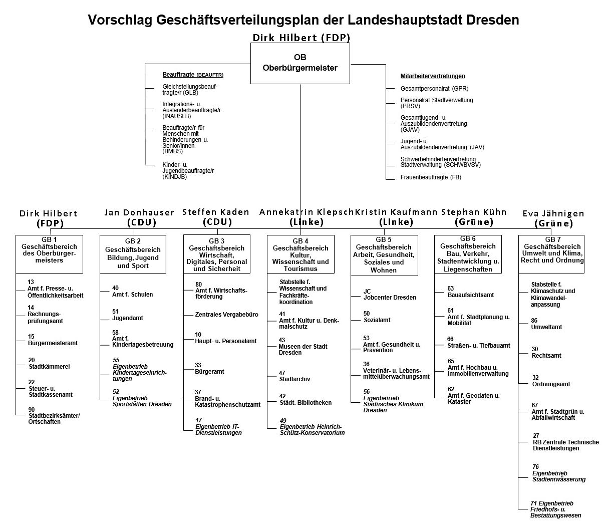 Die Bürgermeisterriege wird um eine Position gekürzt. Die Aufgaben des Finanzbürgermeisters (bisher Peter Lahmes, SPD) werden weitestgehend von OB Dirk Hilbert übernommen. Die anderen Bürgermeisterämter teilen sich CDU, Grüne und Linke auf. Dafür müsste die Hauptsatzung der Stadt geändert werden, das ginge mittels einfacher Mehrheit im Stadtrat.
