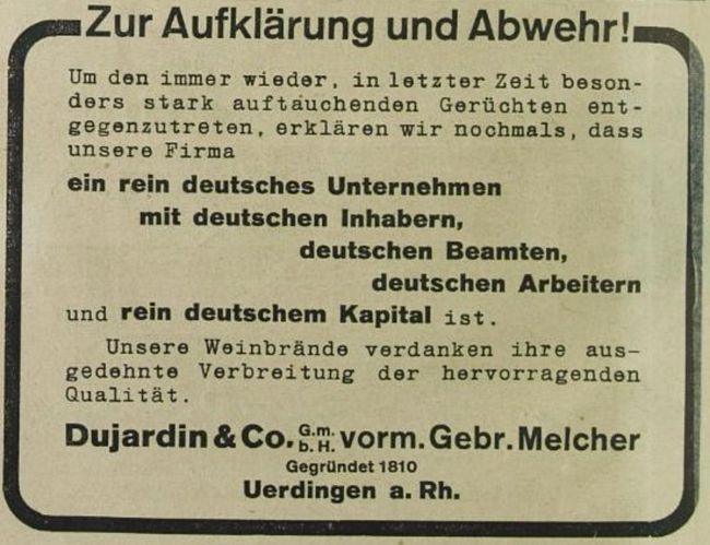 „Witzig finde ich, dass hiesige Fabriken, die einen französischen Markennamen haben, wie diese Cognac-Firma4, gleich Werbeanzeigen inserierten und versicherten, sie seien rein deutsche Unternehmen und hätten mit den Franzmännern nichts am Hut. Ich habe seit dem Krieg auf meiner Speisekarte sowieso keine ‚Soßen und Bouillon‘ mehr, sondern nur noch Tunken und Suppen.“