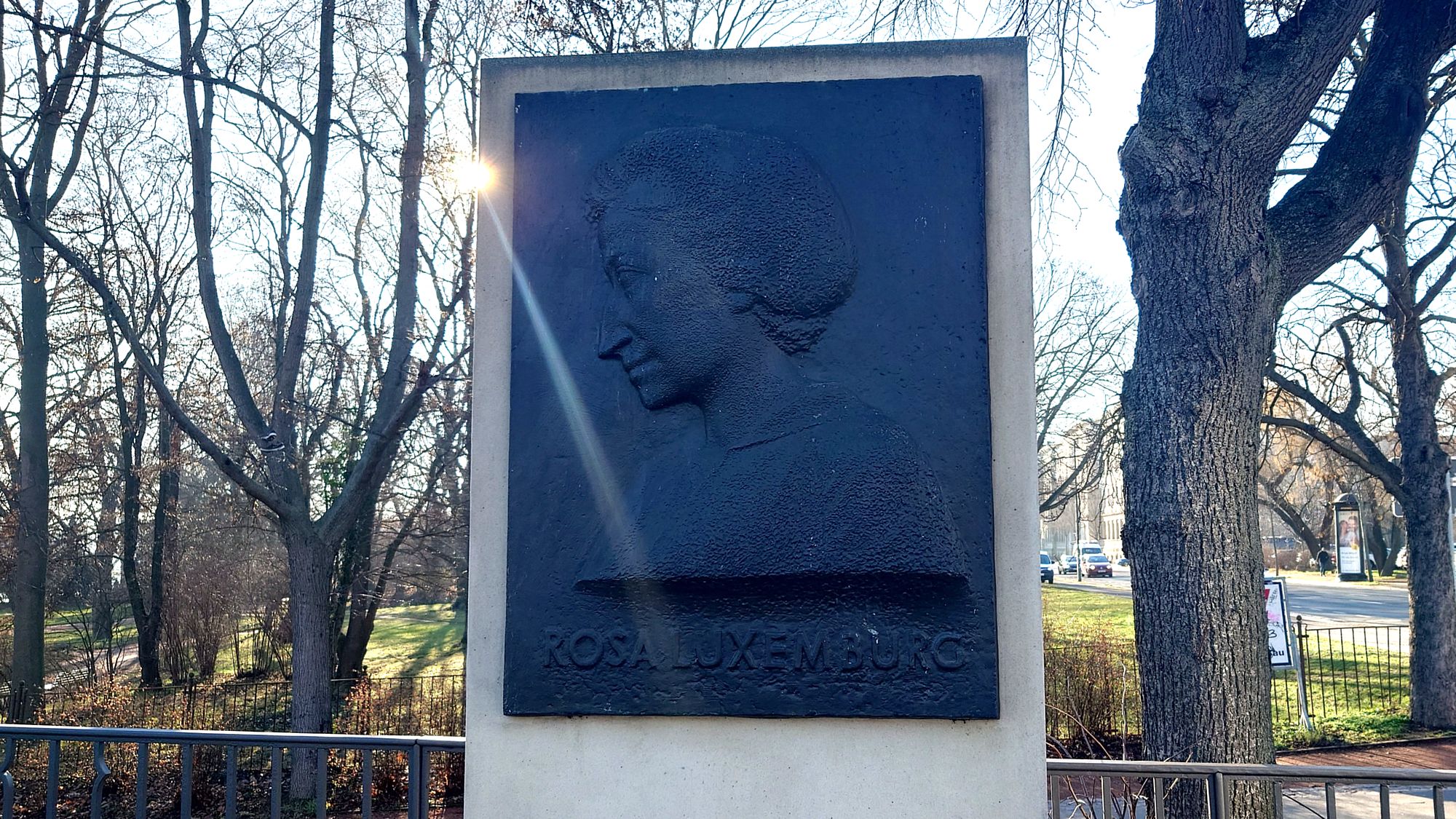 Mit dem Rosengärtchen im Rücken sieht man auf der gegenübeliegenden Seite nebeneinander das Denkmal und die Gedenktafel für Rosa Luxemburg.