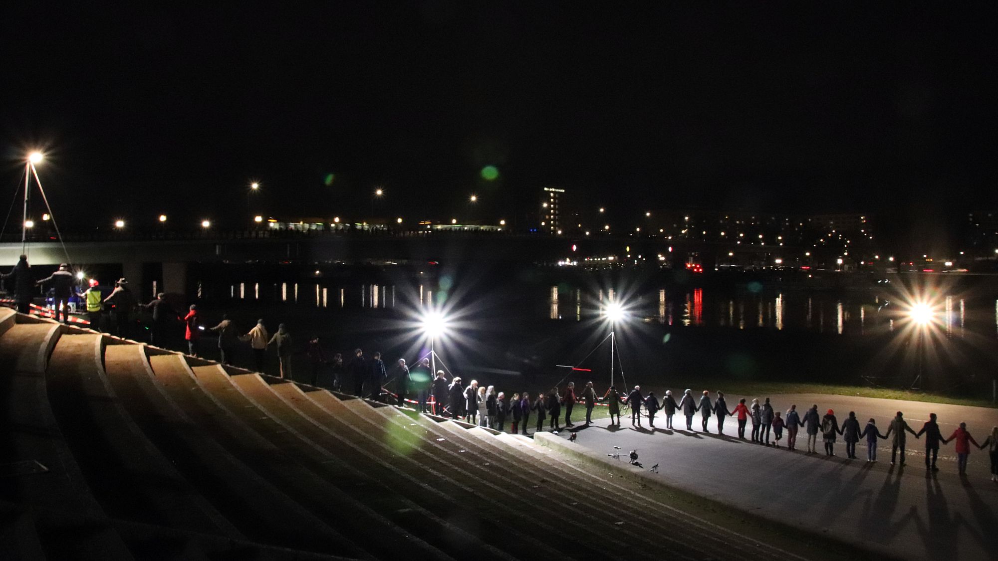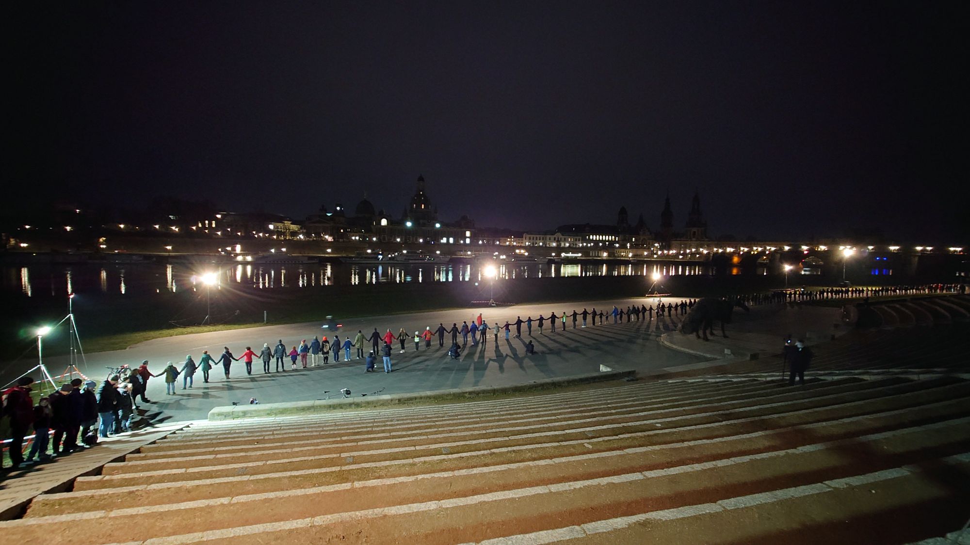 Wie in vergangenen Jahren, leuchtete das THW das dunkle Elbufer aus. Erstmalig fand in diesem Jahr die Szenerie jedoch vor einer dunklen Dresden-Kulisse statt. 2010 hatte der damalige TU-Rektor Hermann Kokenge die Menschenkette initiert, um auch ein symbolisches Zeichen gegen den Missbrauch des Datums durch Rechtsextreme zu setzen. 2011 überquerte die Menschenkette erstmals die Elbe.