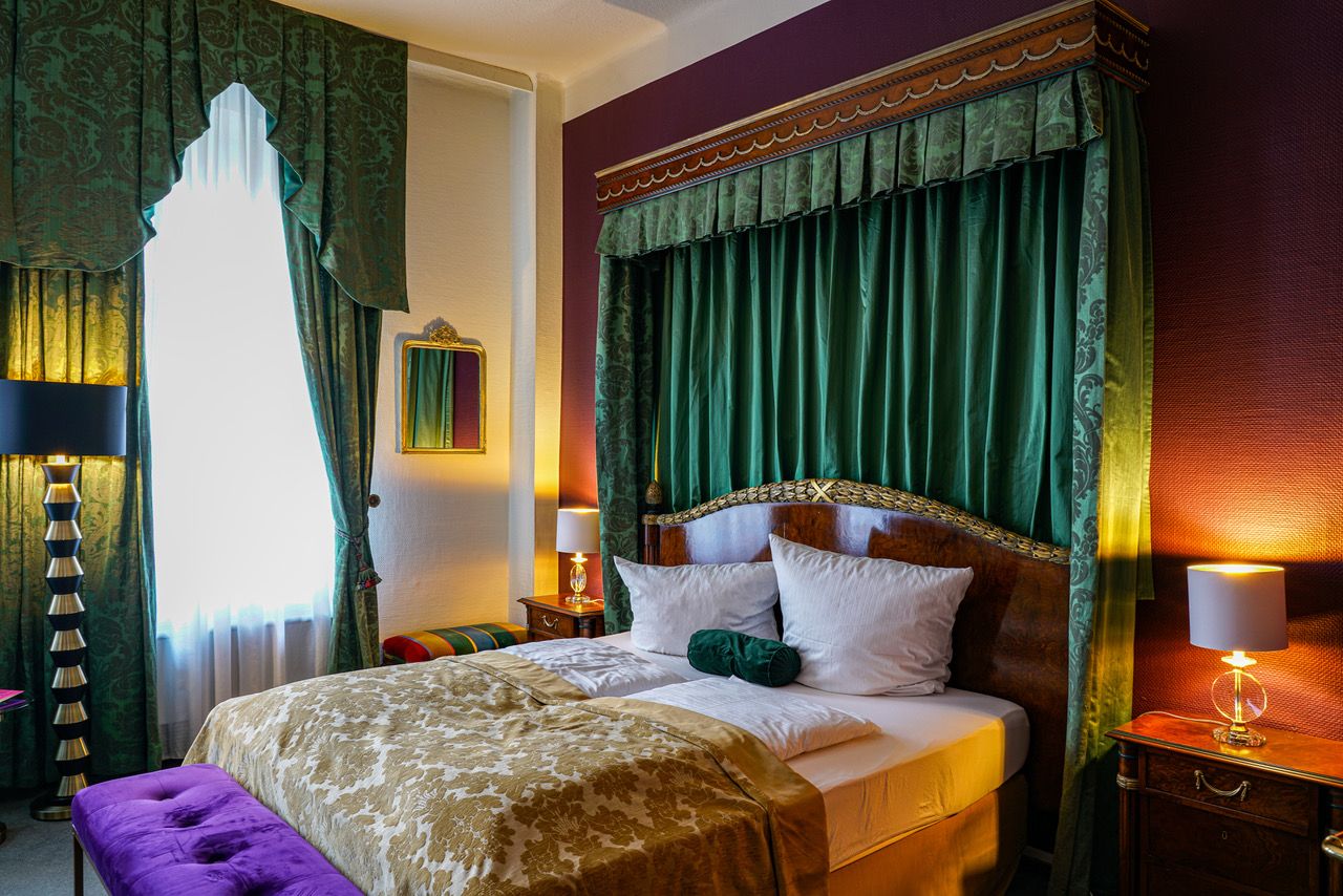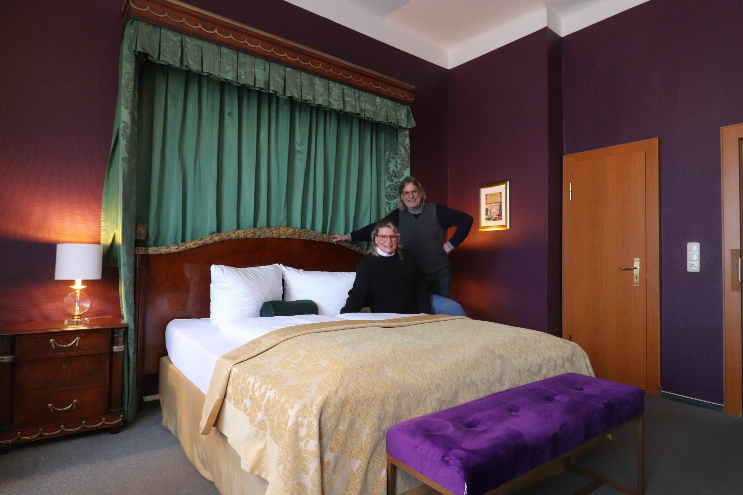 „Es gibt in Berlin ein Unternehmen, die Twins Company, die haben sich auf gebrauchte Möbel spezialisiert“, erzählt Luisa. Und als bekannt wurde, dass das Kempinski-Hotel im Dresdner Taschenbergpalais seine Möbel auswechseln will, haben die gleich zugeschlagen. „Und weil wir einen guten Kontakt haben, konnten wir uns die Präsidenten-Suite sichern“, sagt Luisa. Zumindest den wichtigsten Teil, das Bett mit dem zauberhaft grünen Baldachin. „In dem haben schon Barack Obama, Elton John oder Angela Merkel übernachtet“, zählt Luisa auf.