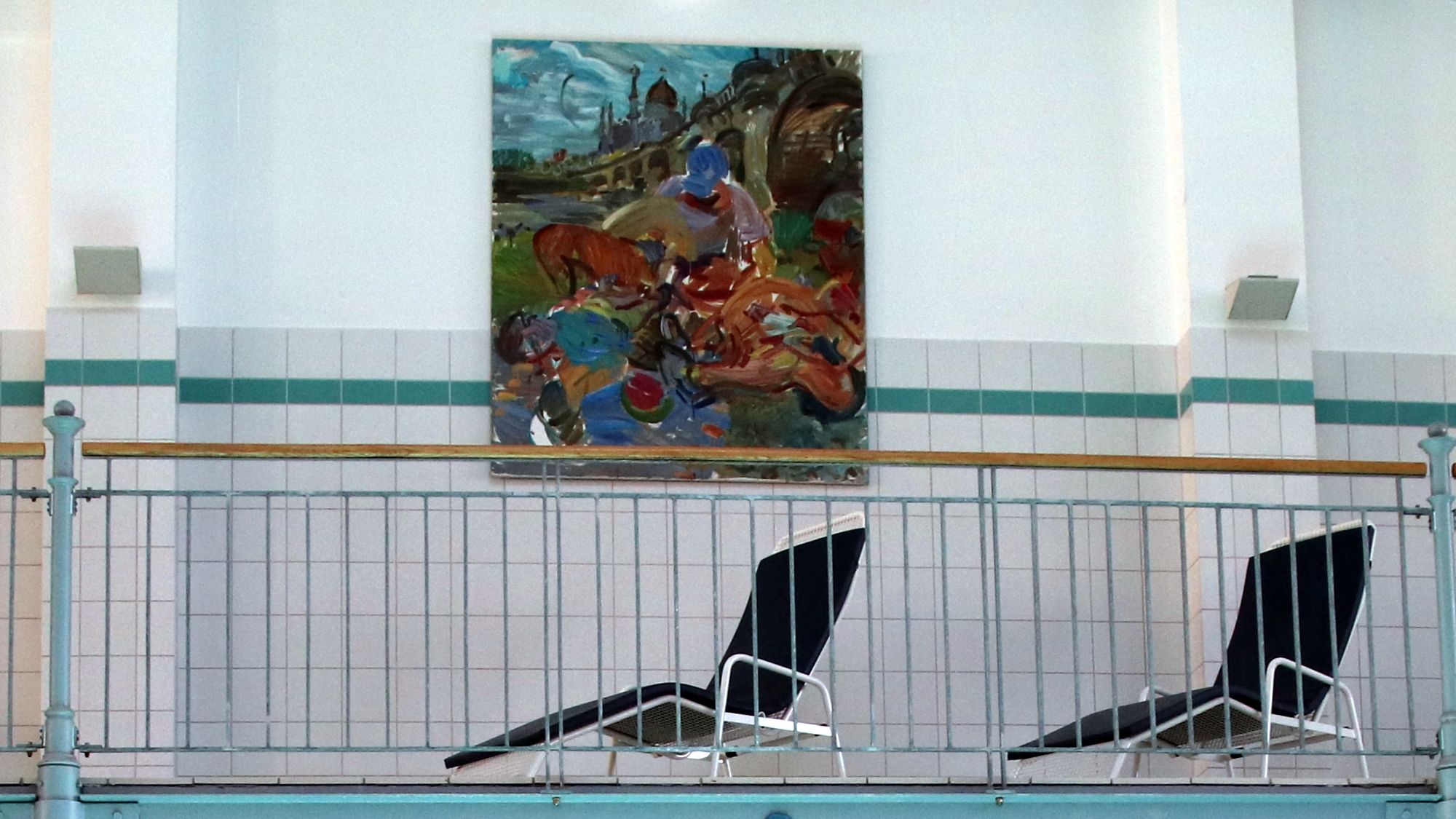 Stolz deutete Matthias Waurick auf ein Gemälde im oberen Bereich des Foyers: „In Zusammenarbeit mit der Galerie Flox wird es hier auch eine dauerhafte Kunstaustellung geben“. Für die Inhalte verantwortlich ist Galerist Hellfried Christoph: „Der Maler Jörn Diederichs ist seit Jahren Stammgast hier im Nordbad und hat so manchen Mitarbeiter und Gast schon skizziert.“