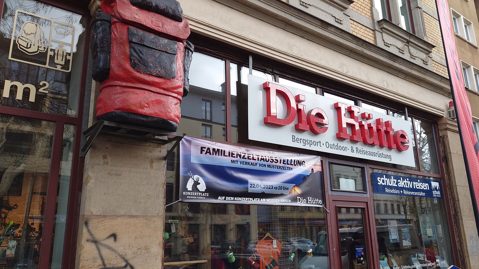 Im Oktober 1991 eröffnete Jürgen Kunze im Keller eines Wohnhauses ein Geschäft mit Wanderzubehör. Zwei Jahre später gab es ein ordenliches Ladengeschäft und den Namen „Die Hütte“, 2002 folgte die richtige Entscheidung mit dem Umzug in die Neustadt. Die Volksbank hatte hier Platz gemacht. Mit dem Reisveranstalter „Schulz Aktiv Reisen“ zog ein passender Untermieter mit ein. 2011 hörte der Gründer altersbedingt auf und übergab die Geschicke Tilo Wenig. Der hatte sowohl Outdoor- als auch Neustadt-Erfahrung, führte er bis dahin einen Kletter-Laden in Neustadt nahe der tschechischen Grenze.