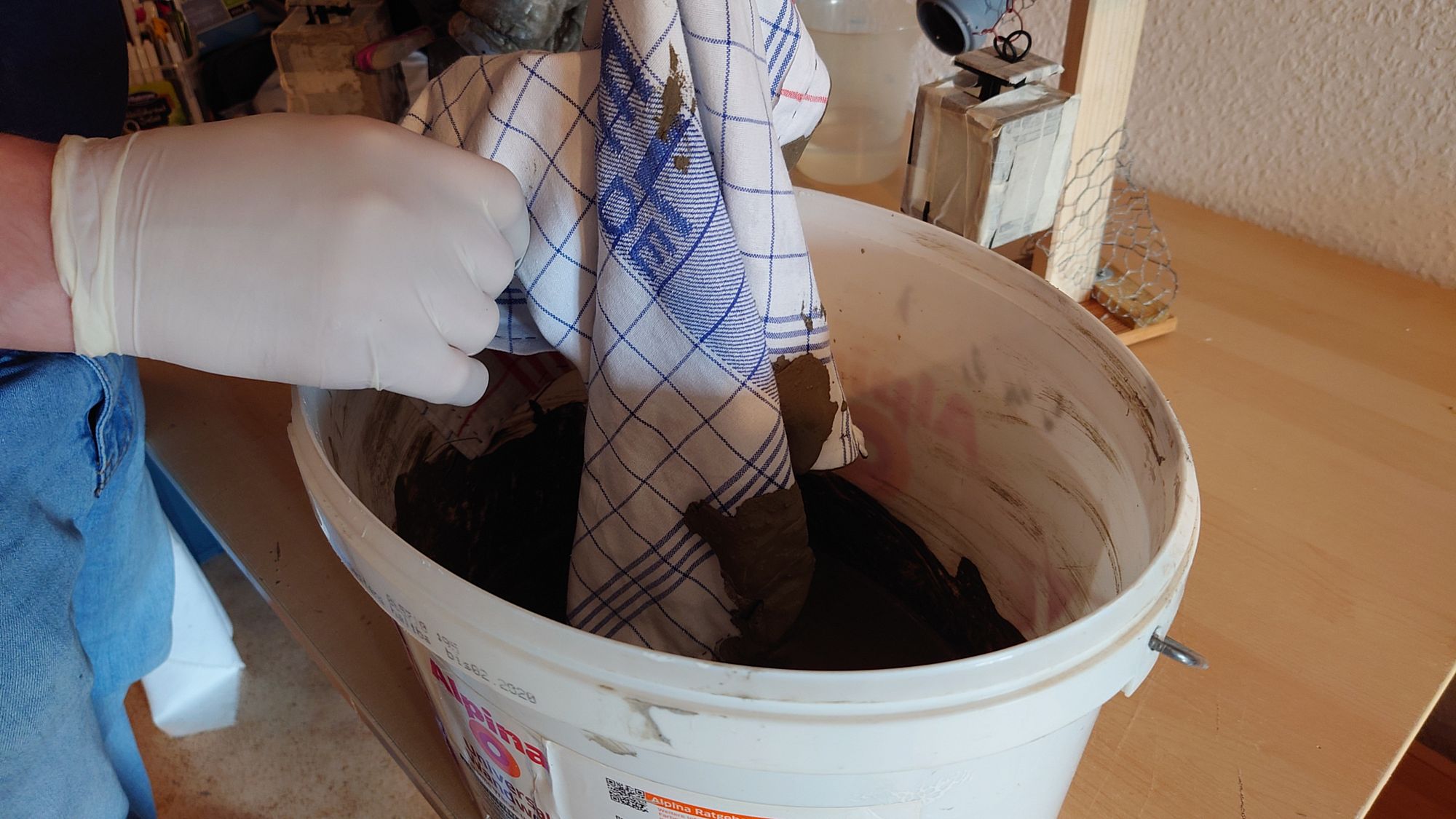 Nach dem der Zement sehr dünn angerührt wurde, wird ein einfaches Baumwoll-Geschirrtuch darin eingetaucht.