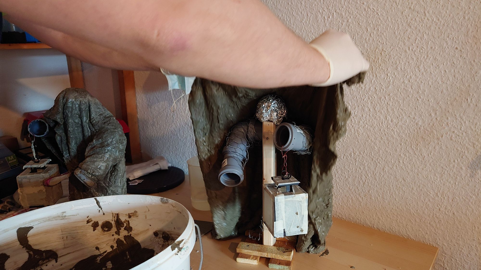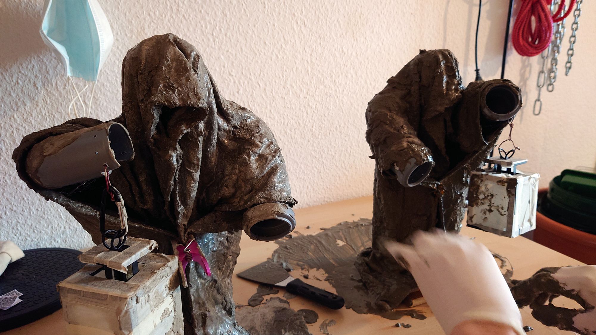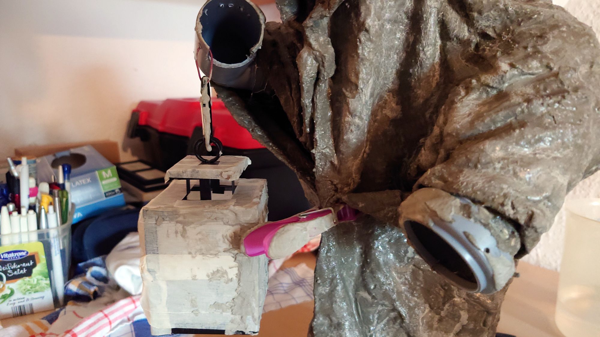 Die Werkstatt entpuppt sich als ein Hinterzimmer in der Nähe der Hauptstraße. McBone wirft eine Handvoll Zement in einen Farbeimer, gibt Wasser dazu und rührt kräftig um. Dann taucht er ein Geschirrtuch in die Pampe und stülpt das ganze dann über ein Gestell aus Holz und Abflussrohren. Noch ein bisschen Zement-Pappe drüber und schon ist der Tod fertig. Naja fast.