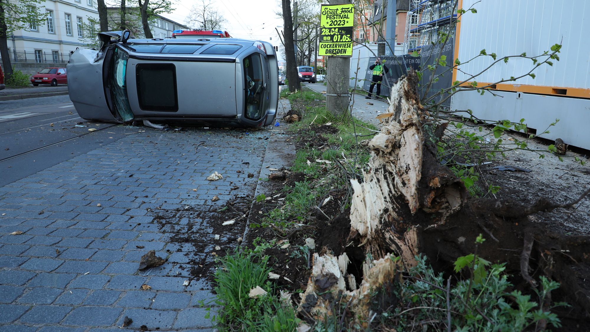 Heute hat sich am Morgen, gegen 6.10 Uhr auf der Königsbrücker Straße ein Verkehrsunfall ereignet. In Höhe des Landesfunkhauses des MDR nahe der Kreuzung zur Stauffenbergallee war der 61-jährige Fahrer eines Subaru Forester stadteinwärts unterwegs. Aus bisher noch ungeklärter Ursache prallte das Fahrzeug gegen einen Baumstumpf und kippte anschließend um.