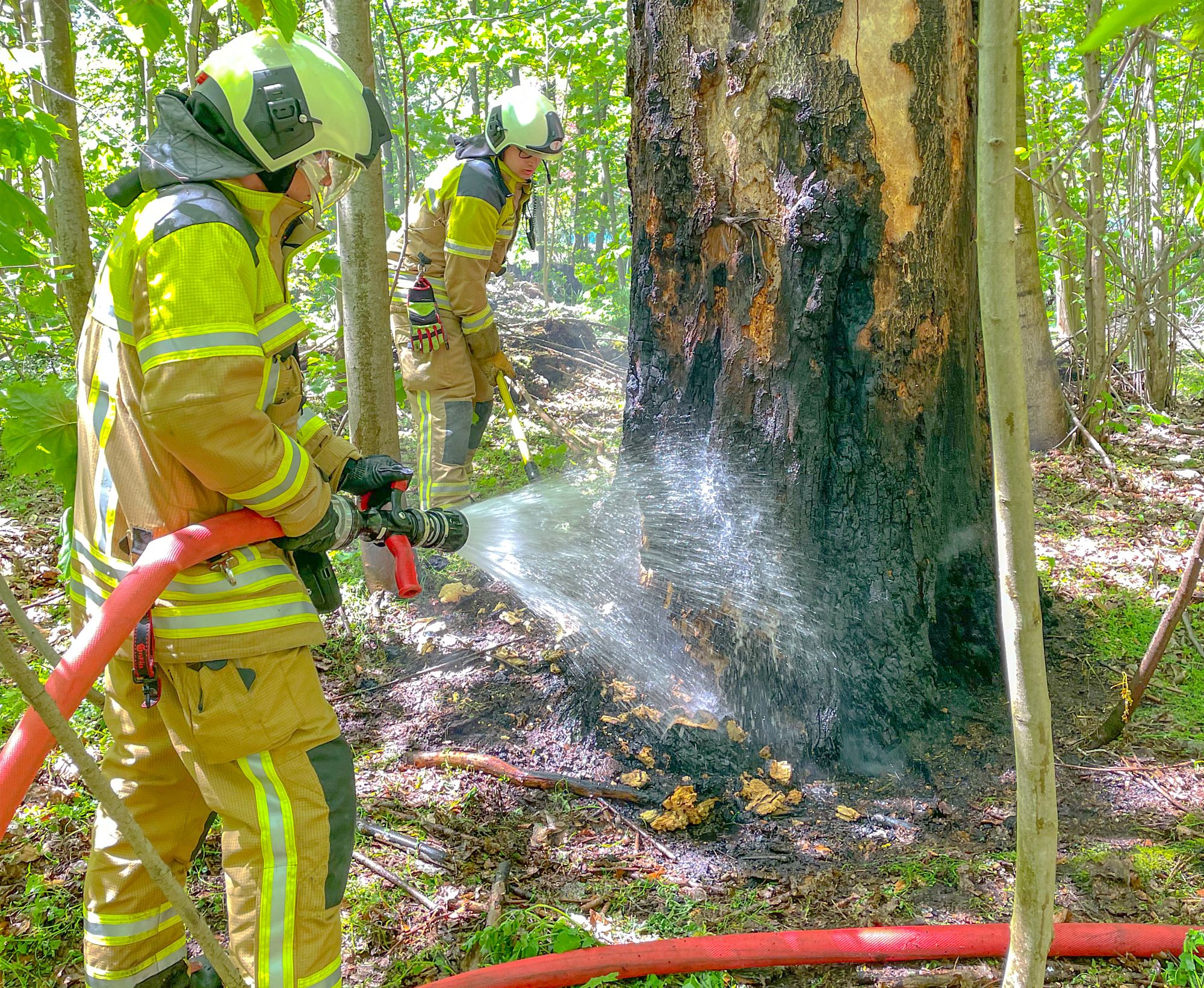 Zehn Minuten später meldeten sich Passanten bei den Einsatzkräften und führten sie zu einer Einsatzstelle am Manfred-von-Ardenne-Ring. Dort brannten etwa zehn Quadratmeter Waldboden.