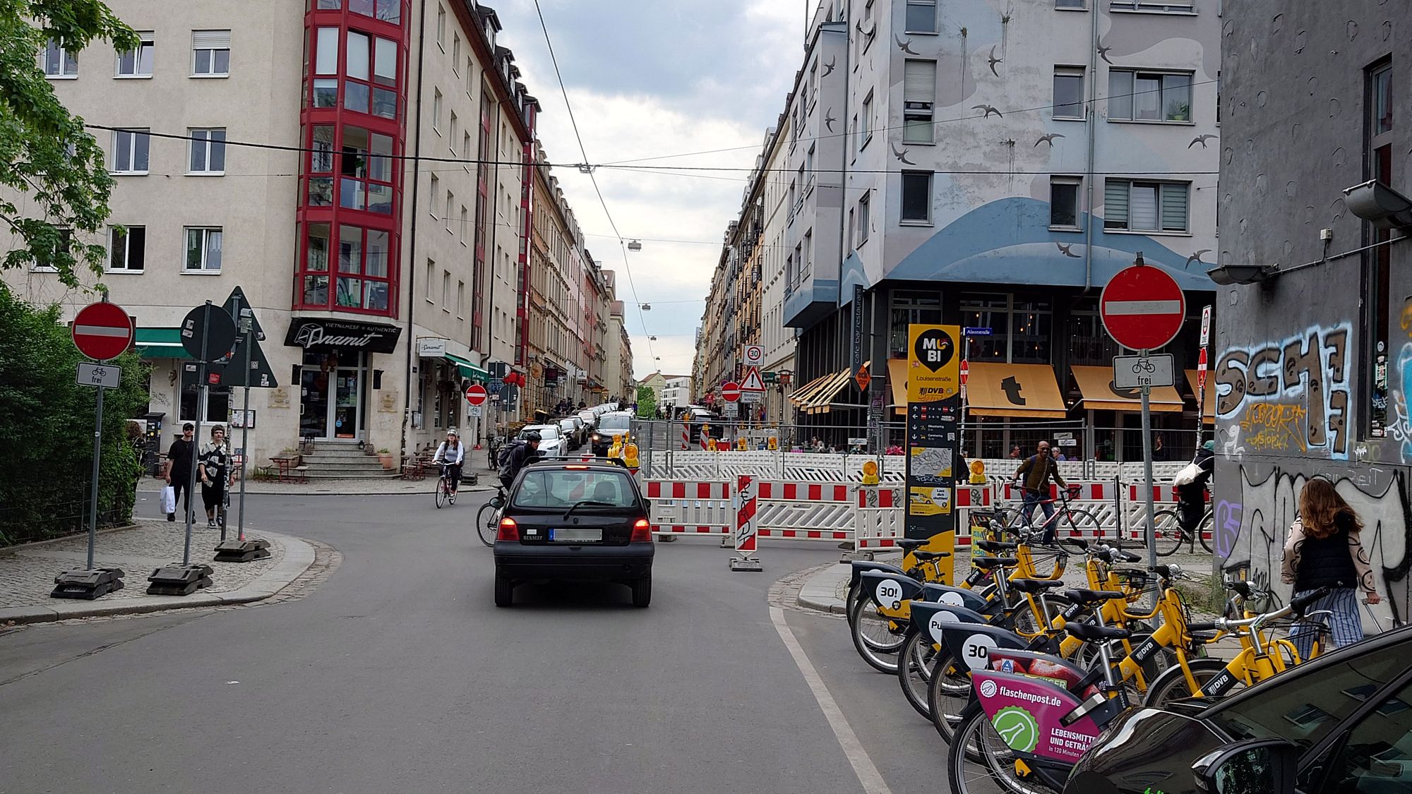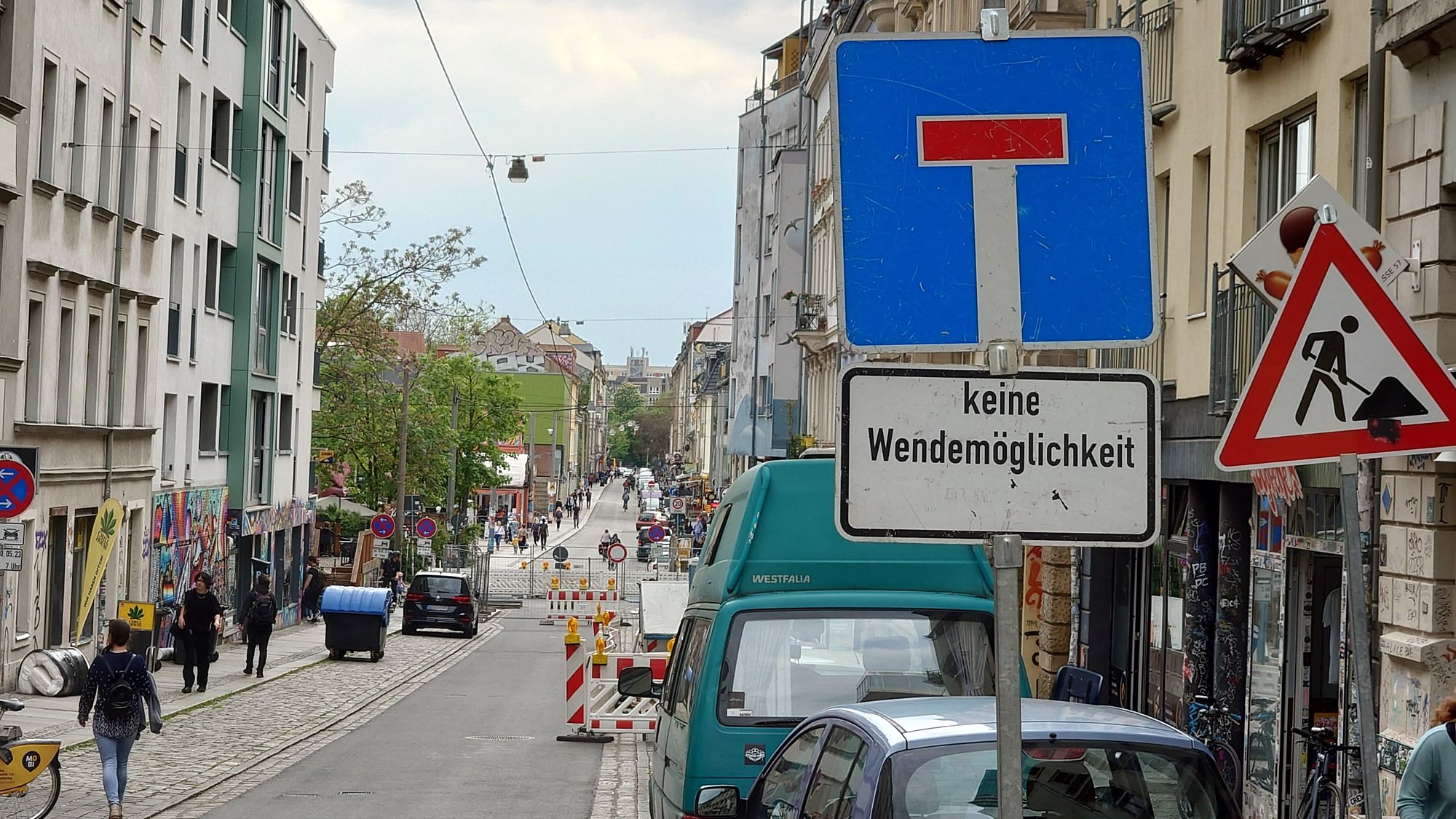 Aber der Reihe nach. Von der Kreuzung Rothenburger kommend, wird man direkt drauf hingewiesen, dass die Straße in einer Sackgasse ohne Wendemöglichkeit endet. In Höhe von Katys Garage ist dann für Autos Schluss. Vor Ort wurde das geflissentlich ignoriert. Wenn man dann auf der Kreuzung steht, geht es eigentlich nur noch links herum, Richtung Albertplatz. Gradeaus die Louisenstraße heißt es wiederum „Einfahrt verboten“. Rechts hoch ging ja bisher nicht und nun dank Gittern auch nicht mehr. Links und rechts der Gitter quetschen sich Fußgänger*innen und Radfahrende über die Fußwege, eng an den Stühlen des „Eckstein“ vorbei.