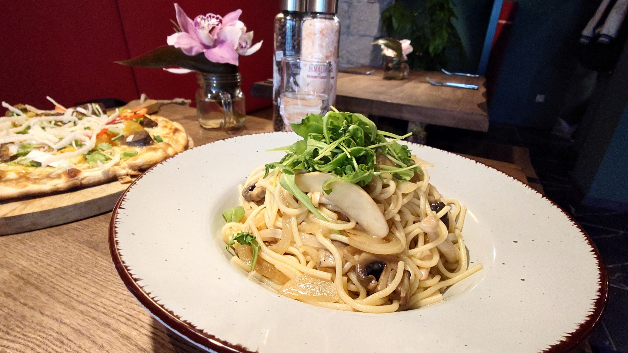 Die Speisekarte verspricht doch etwas anderes, als beim Italiener. So gibt es Kimchi-Pizza und Rice-Cake-Pizza. Auch bei den Nudeln locken exotische Gerichte, wie die Sake-Crema-Spaghetti oder Mushroom Butte Shoyu Spaghetti. Letztere bestelle ich.