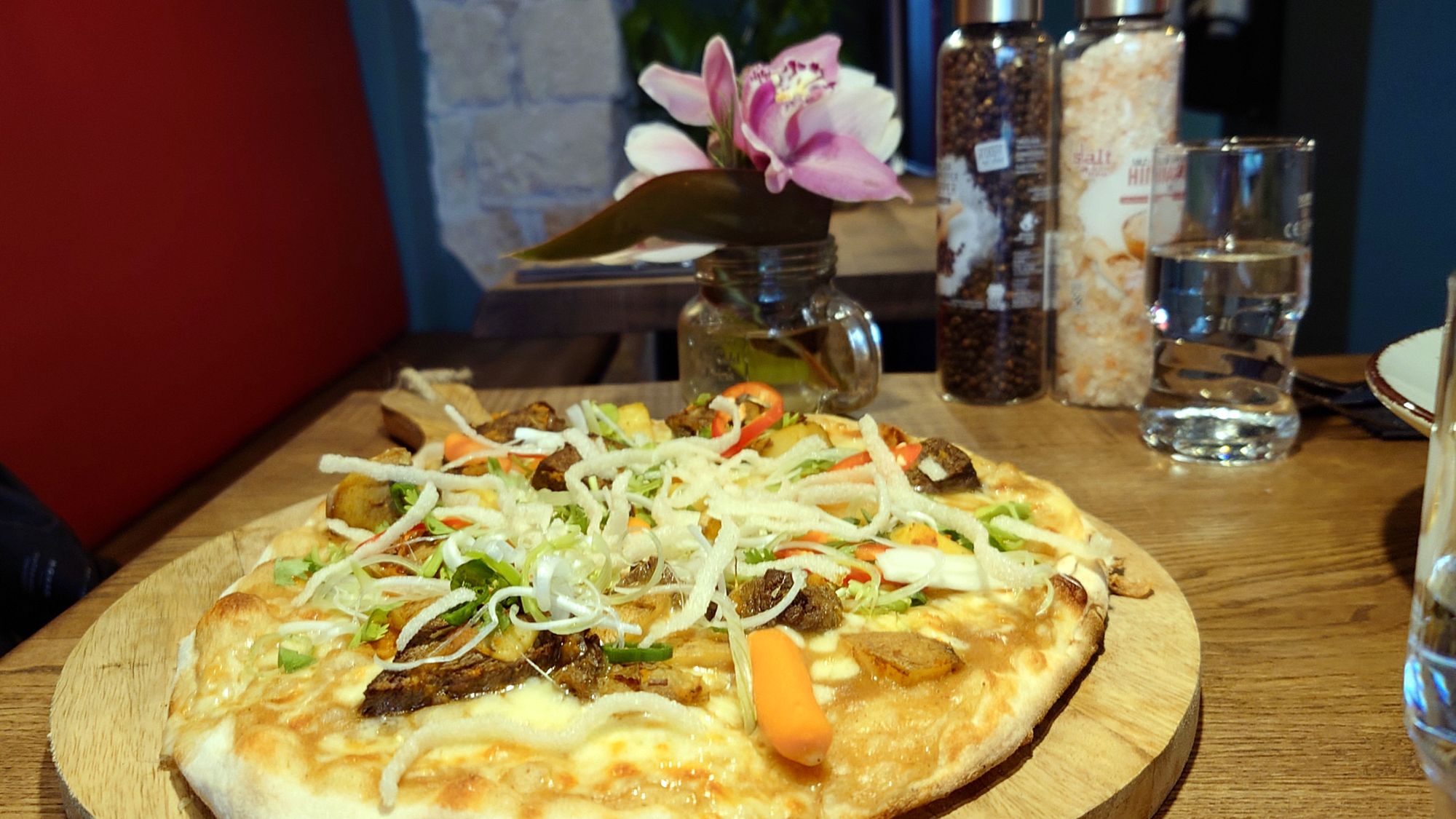 Währenddessen schnurpst meine Begleiterin ihre Pizza, die umfangreich belegt und knusprig cross gebacken ist. Auch hier, besteht, so ihre Aussage, keine Verwechslungsgefahr zu italienischer Küche, aber schmackhaft und sättigend sei es doch. Fazit: eine gelungene Fusion aus asiatischer und italienischer Küche.