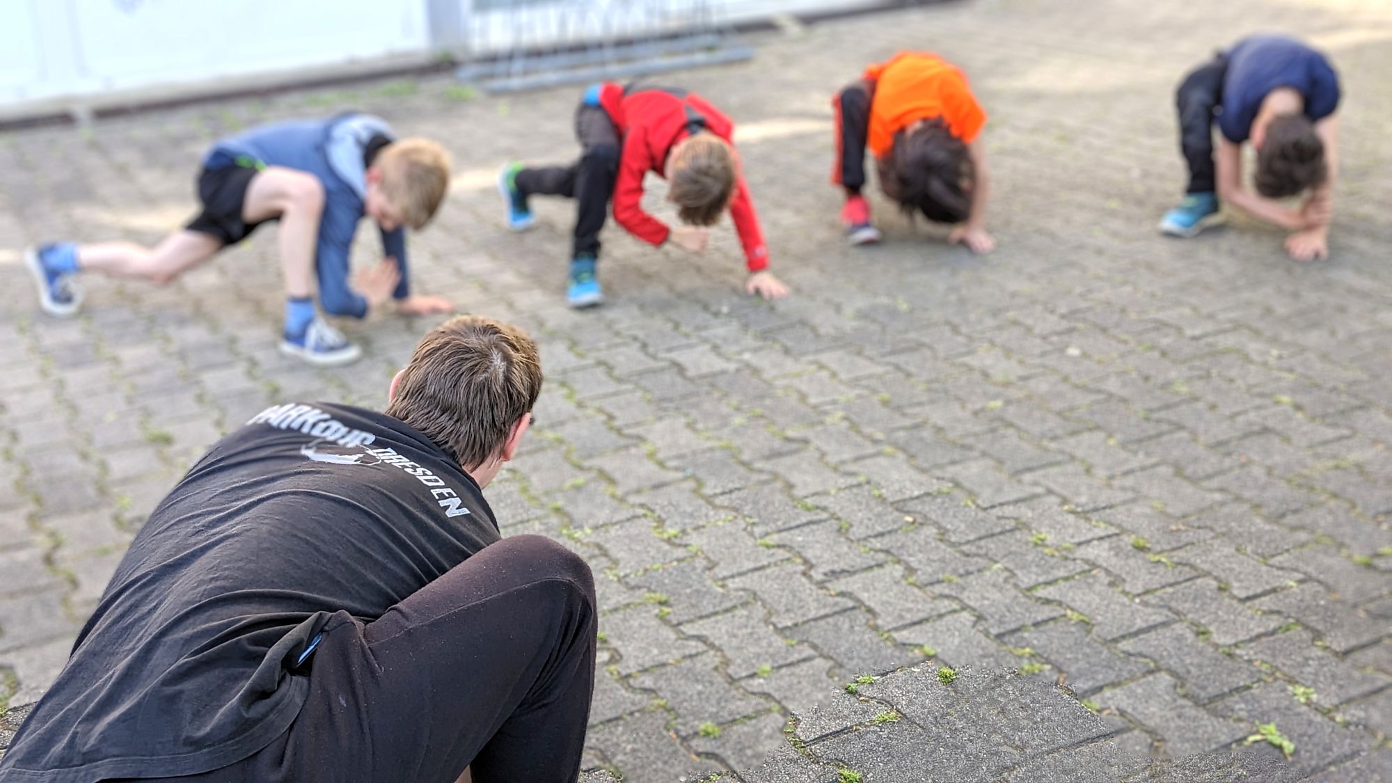 Die wichtigsten Trainingswerte erklären Jonas und Daniel den etwa zehn Kindern der Nachmittagsgruppe am Donnerstag mithilfe einer Hand. Der Daumen steht für die Unterstützung. „Als Gemeinschaft wächst und lernt man gemeinsam und hilft sich wo es geht.“ Der Zeigefinger steht für zielgerichtetes Handeln und die Frage: Warum führe ich diese Bewegung überhaupt aus? Was ist mein Ziel? Der Mittelfinger symbolisiert den Respekt gegenüber der Umgebung, den Mitmenschen und dem eigenen Körper. Der Ringfinger steht für Vertrauen in sich und die eigenen Fähigkeiten und der kleine Finger – tja, Bescheidenheit. Denn bei Parkour geht es nicht um Konkurrenzdenken oder Wettbewerb.