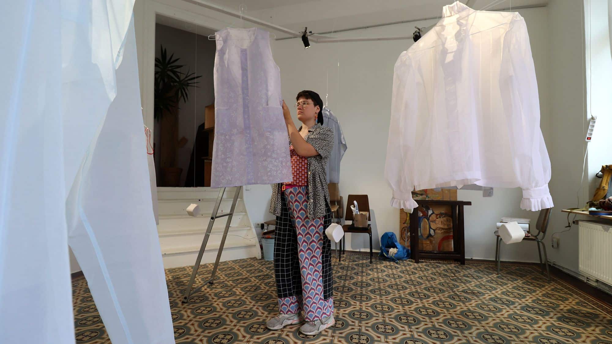 Die 28-Jährige studiert an der Hochschule für bildende Künste (HfbK) Kostümdesign und die Ausstellung in der Jordanstraße zeigt ihre Diplomarbeit. Das Besondere an der Ausstellung, die Kleidungsstücke, die sie nach Originalvorlagen gefertigt hat, sind allesamt transparent. „Ich will damit verdeutlichen, dass auch Erinnerungen verblassen und in unserem Kopf immer wieder von neuen Eindrücken überschrieben werden“, sagt sie.
