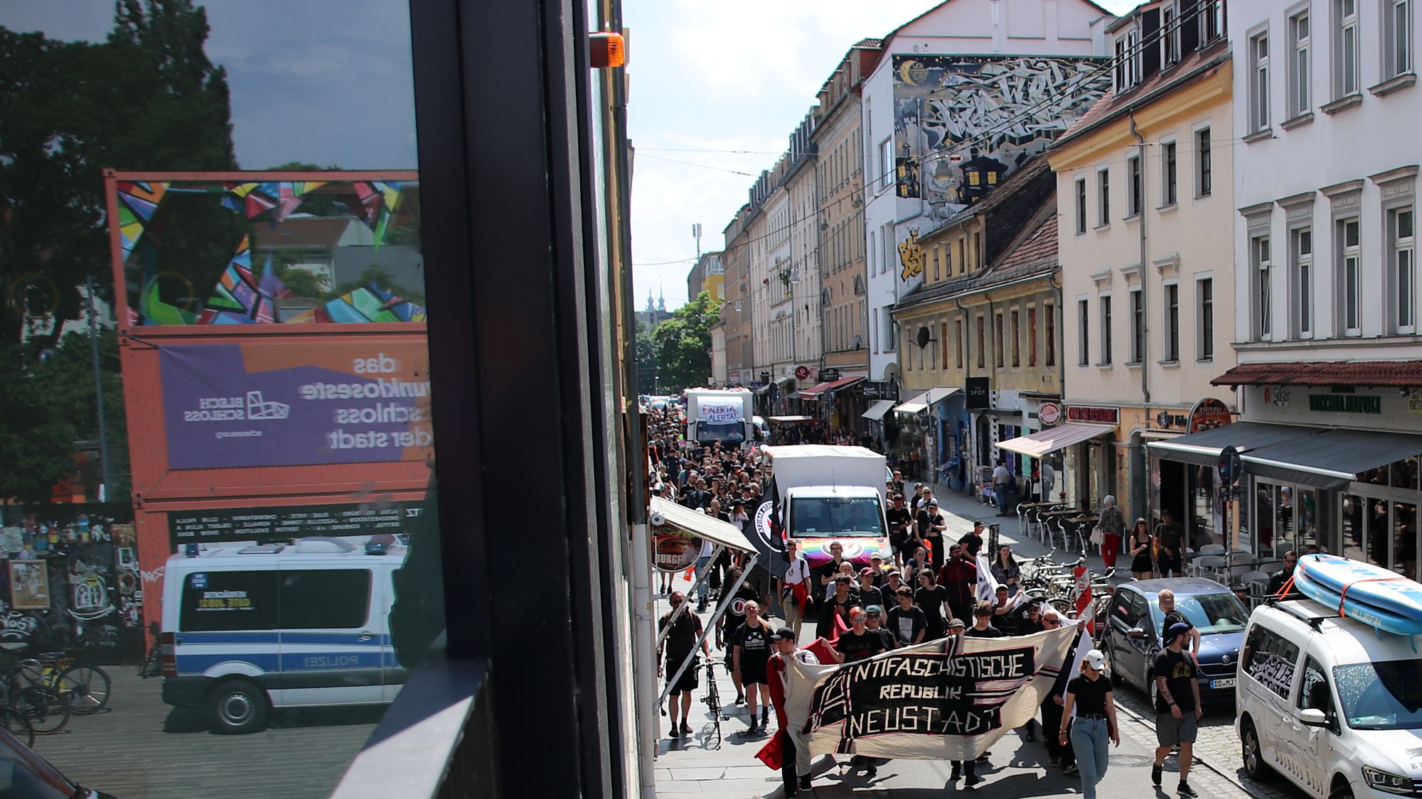 Allen voran die Antifaschistische Tanz-Demo am Sonnabend, die einen wahren Marathon beschritt und sich dabei nicht scheute, Abstecher in das Hechtviertel und die Innere Neustadt zu unternehmen. Rund siebeneinhalb Stunden tanzten, spazierten und skandierten ein paar hundert Leute durch das Viertel mit lauter Musik und jeder Menge Redebeiträgen. Vertreter*innen des Freistaats sicherten mit Blaulicht und Uniform die Straßen ab. „Es kam zu keinen Störungen“, hieß es später lapidar in einer Pressemitteilung.