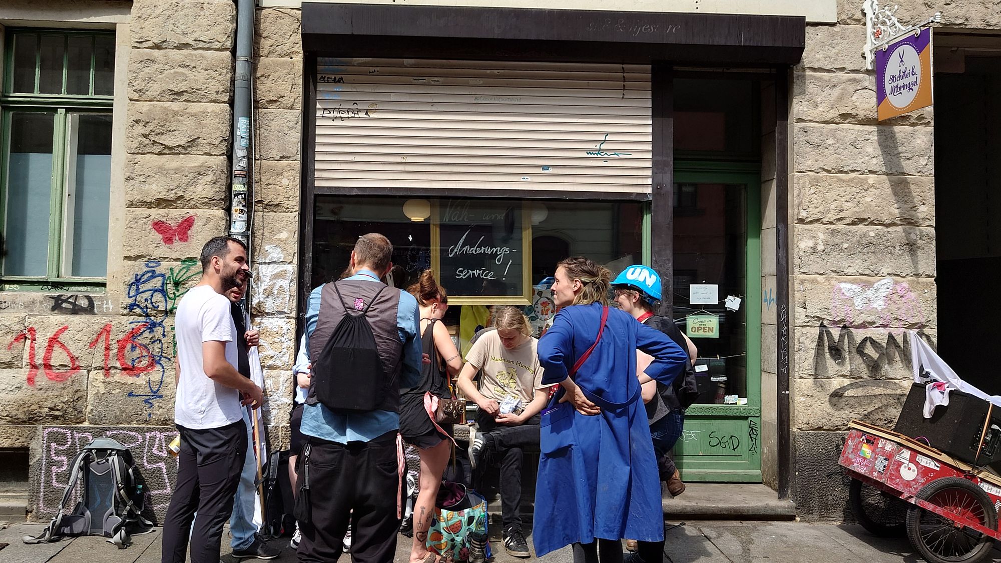 Gut besucht war das Stadtteilhaus, inklusive BRN-Garten und BRN-Museum. Im Garten zeigten der Kurze und Günter Starke alte Bilder aus Zeiten als das Viertel noch grau und die Leute bunt waren. Wie die Museumsdirektorin berichtet, war das Museum über beide Tage gut besucht. Die Besucher*innen kauften auch etliche Jubiläumsflaggen. Ein paar Schritte weiter auf der Prießnitzstraße klang es dann vor dem Atelier von Karen Gäbler nach Jazz und Weltmusik.