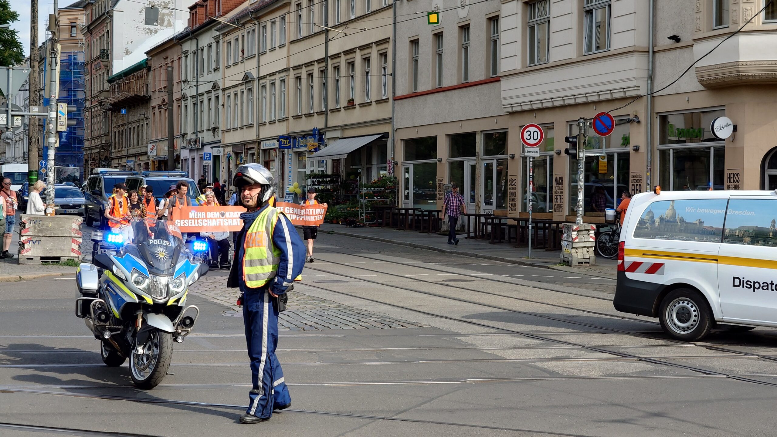 Am Dienstagnachmittag gegen 16.20 Uhr begaben sich acht Personen auf die Kreuzung Antontraße/Leipziger Straße und liefen von dort aus langsam über die Marienbrücke. Die Polizeibeamten verwiesen die nicht angezeigte Versammlung auf den Gehweg. Kurz darauf entfernten sich die Teilnehmer.