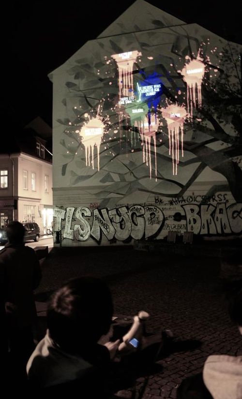 Sven hat mir ein paar Bilder zugespielt. Heute Abend fand die erste SMSlingshot-Action von Sebastian Piatza im Rahmen der Cynetart 2012 statt. Mit einer Art SMS-Zwille wurden leuchtende Texte und Kleckse an die Wand geschossen. Anwesende Kinder waren begeistert und Erwachsene wurden wieder zu selbigen.