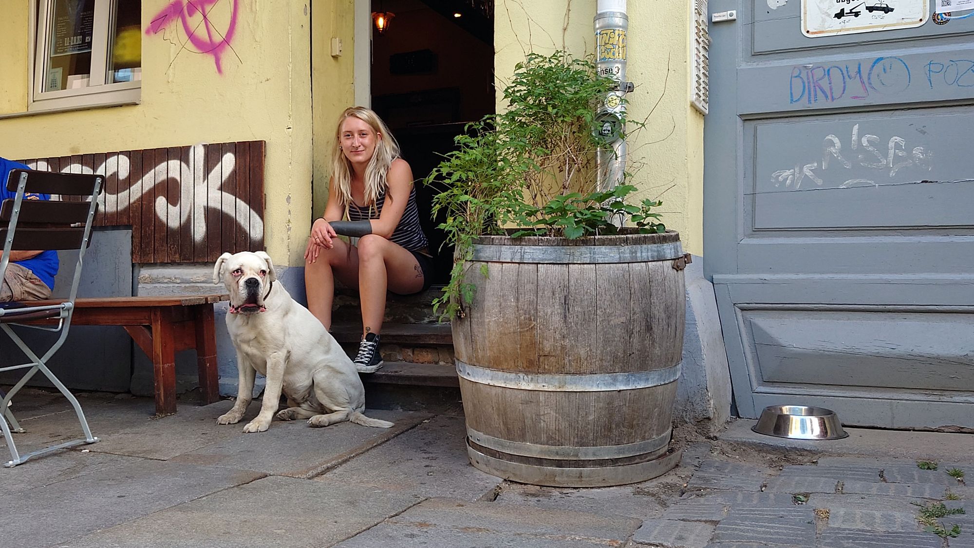 Wir müssen die Küche dringend und grundlegend vorrichten, sagt Nette. Bis dahin gibt es eine Kooperation mit der Pizza-Stube. Und als wäre es abgesprochen, kommt von dort gerade ein Mitarbeiter und bringt ihr eine Pizza. „Die Lieferung ist aber kein Standard“, schmunzelt Nette. Zu ihren Füßen hat sich Betty breit gemacht. Der ist es an diesem Tag entschieden zu heiß, also lümmelt sie zwischen den Beinen der Gäste. Kellnerin Lisa bringt noch ein Bier.