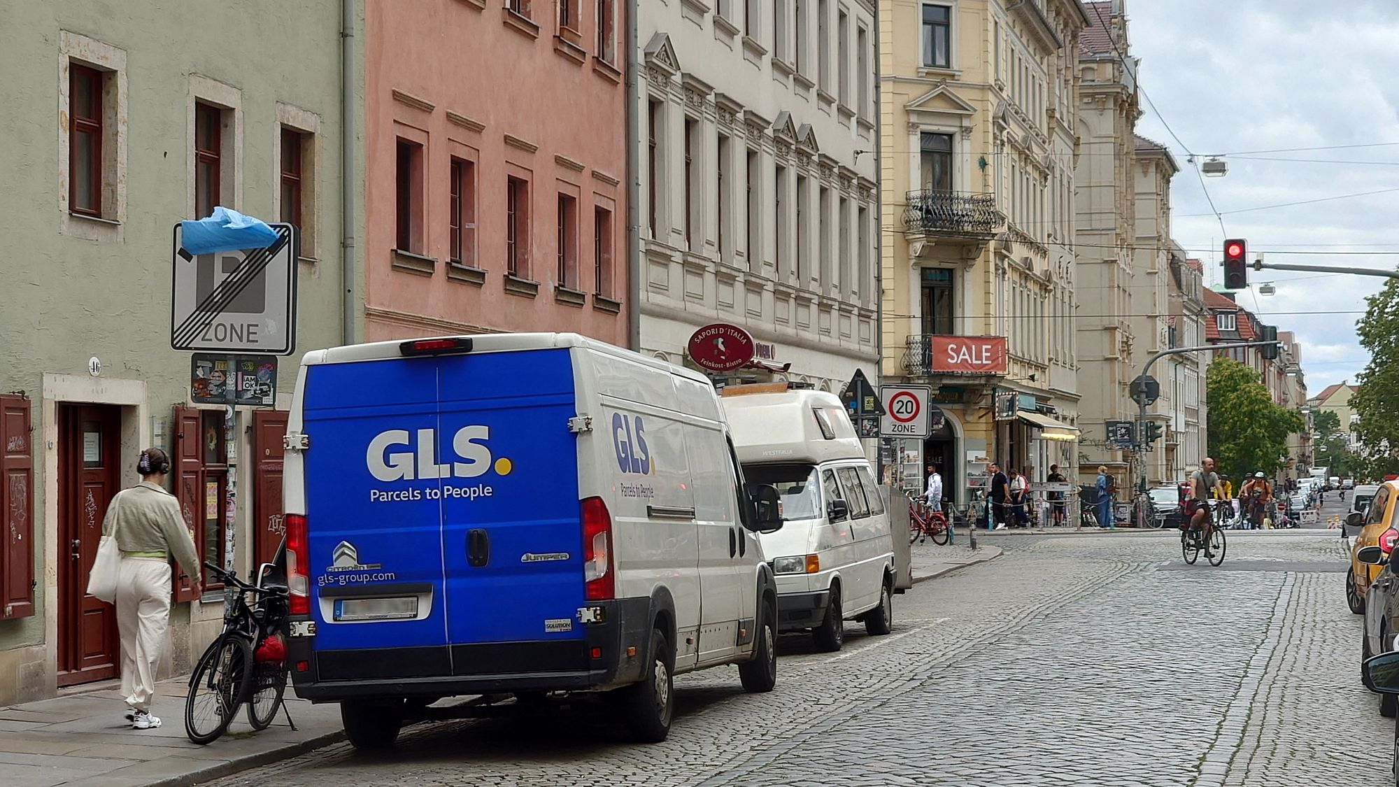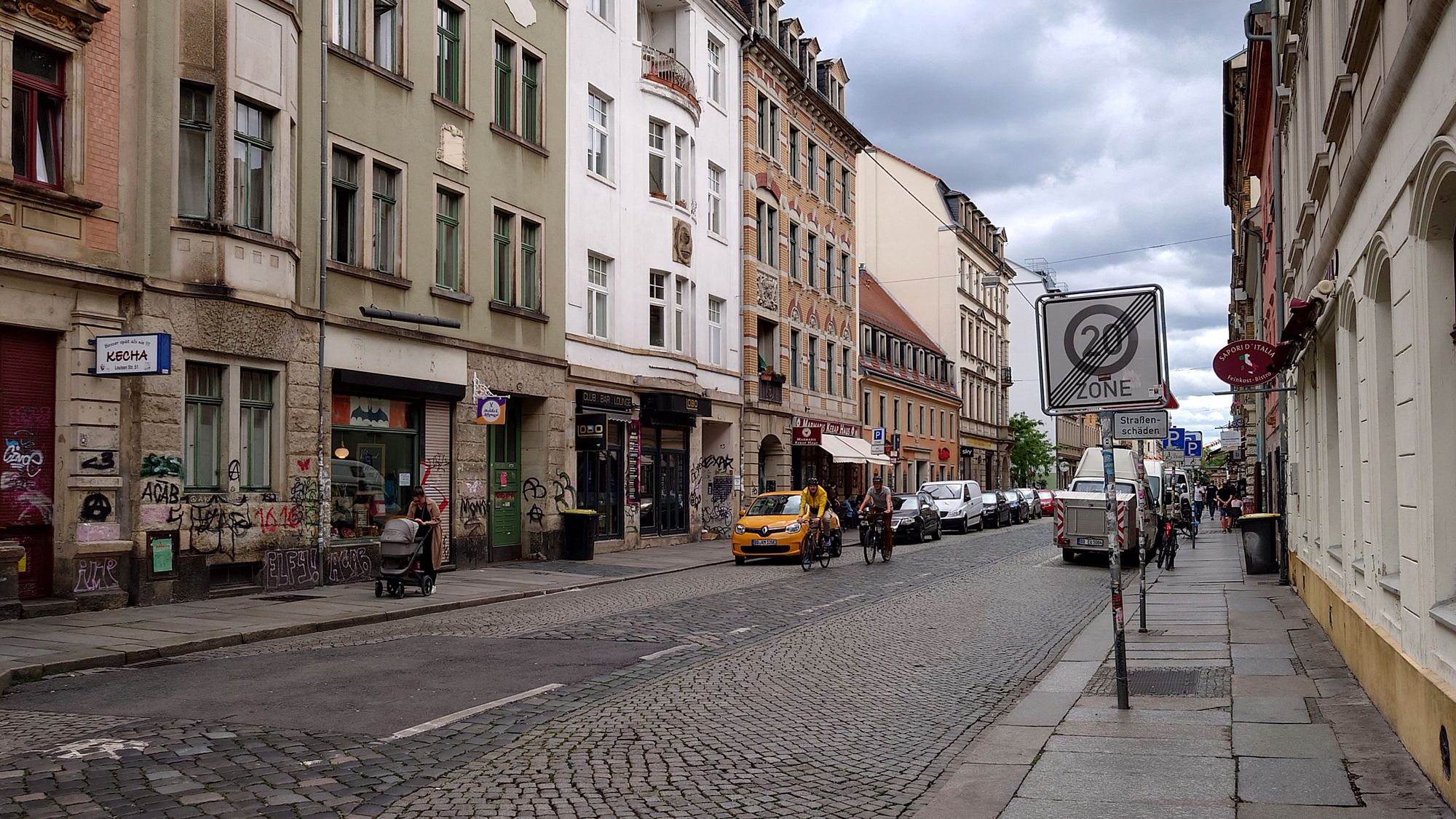 Gut, dass nur drei Meter weiter ein Schild mit dem Hinweis auf Fahrbahnschäden steht. Von der anderen Seite betrachtet, wird es noch merkwürdiger. Warum soll denn nun hier ausgerechnet die Tempo-20-Zone beginnen? Wo sie doch gleich auf Görlitzer und Rothenburger wieder aufgehoben wird und gegenüber vorm Café Continental erneuert wird. Und warum eigentlich flattert eine blaue Tüte an dem Ende der Parkplatz-Zone. Das könnte eine Spätfolge der Bunten-Neustadt-Party auf der Louise gewesen sein.