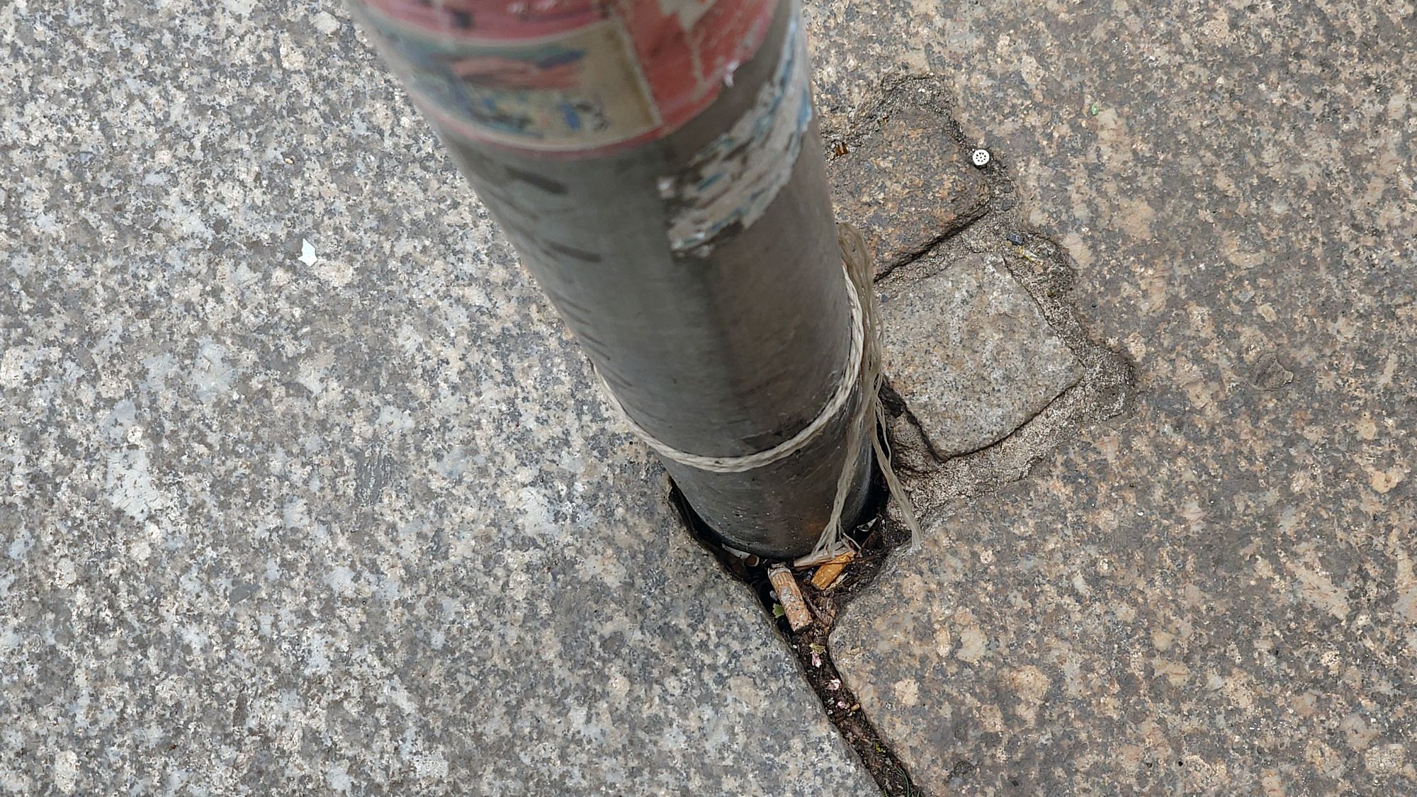 Ein kräftiger Griff an das Schild erklärt den Schildbürgerstreich. Das Zonen-Schild ist offenbar drehbar angebracht. Immerhin scheint es noch halbwegs fest im Sockel zu stecken, aber möglicherweise könnte die Straßenverkehrsbehörde hier mal am Schild drehen.