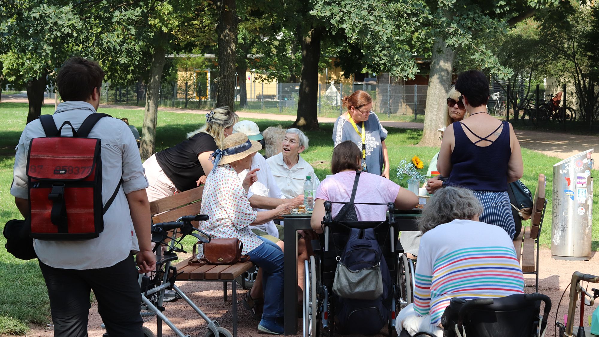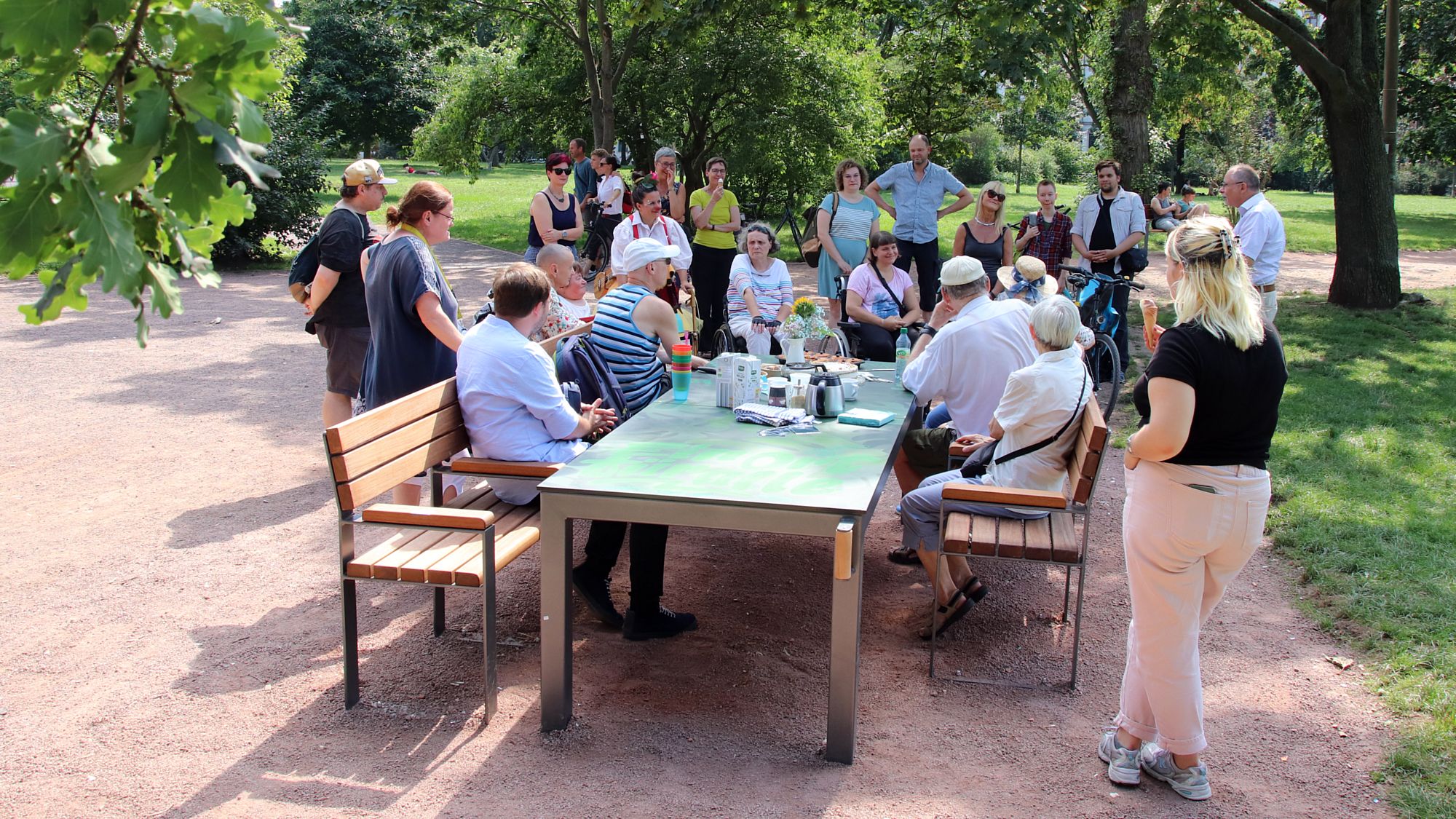 Bänke und Tisch stehen schon seit ein paar Wochen auf der östlichen Seite des Alaunparks, nahe der Kita. Gestern wurde mit einem bisschen Musik, Torte und vielen Neugierigen die Barrierefreie Generationensitzgruppe eingeweiht.