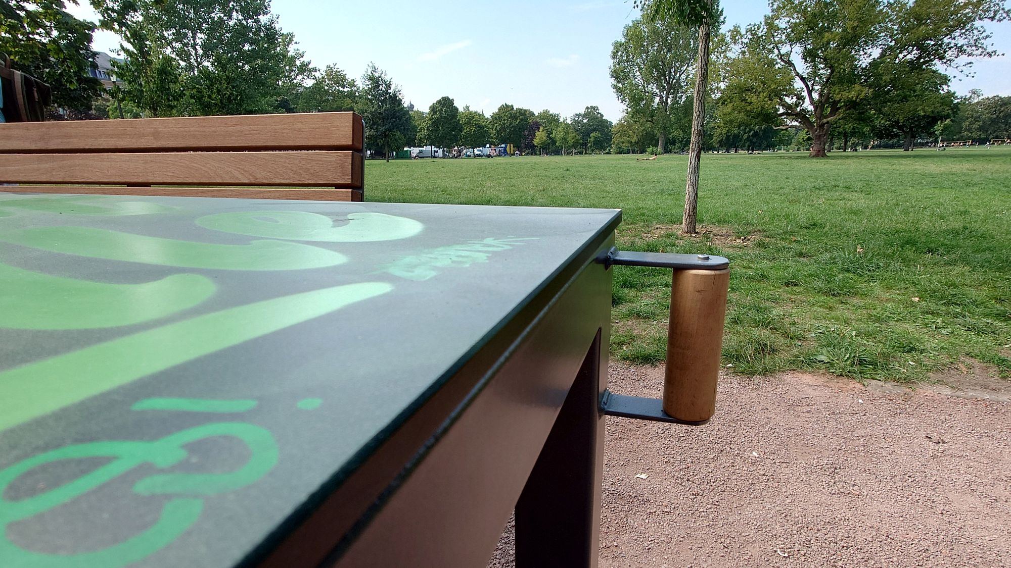 Annett Heinich von der Initiative „Neustadt(T)Raum“ freut sich. Die stabilen Griffe seien für Menschen im Rollstuhl gut geeignet, um sich an den Tisch heran zu ziehen oder um das Aufstehen zu erleichtern. Der Tisch ist etwa 2,70 Meter lang und einen Meter breit und an den Stirnseiten für Rollstuhlfahrer unterfahrbar. Die Tischplatte ist mit einem Graffiti gestaltet, in das ein Schachbrettes eingelassen ist. In den ersten Wochen blieb die Oberfläche von Vandalismus fast verschont.