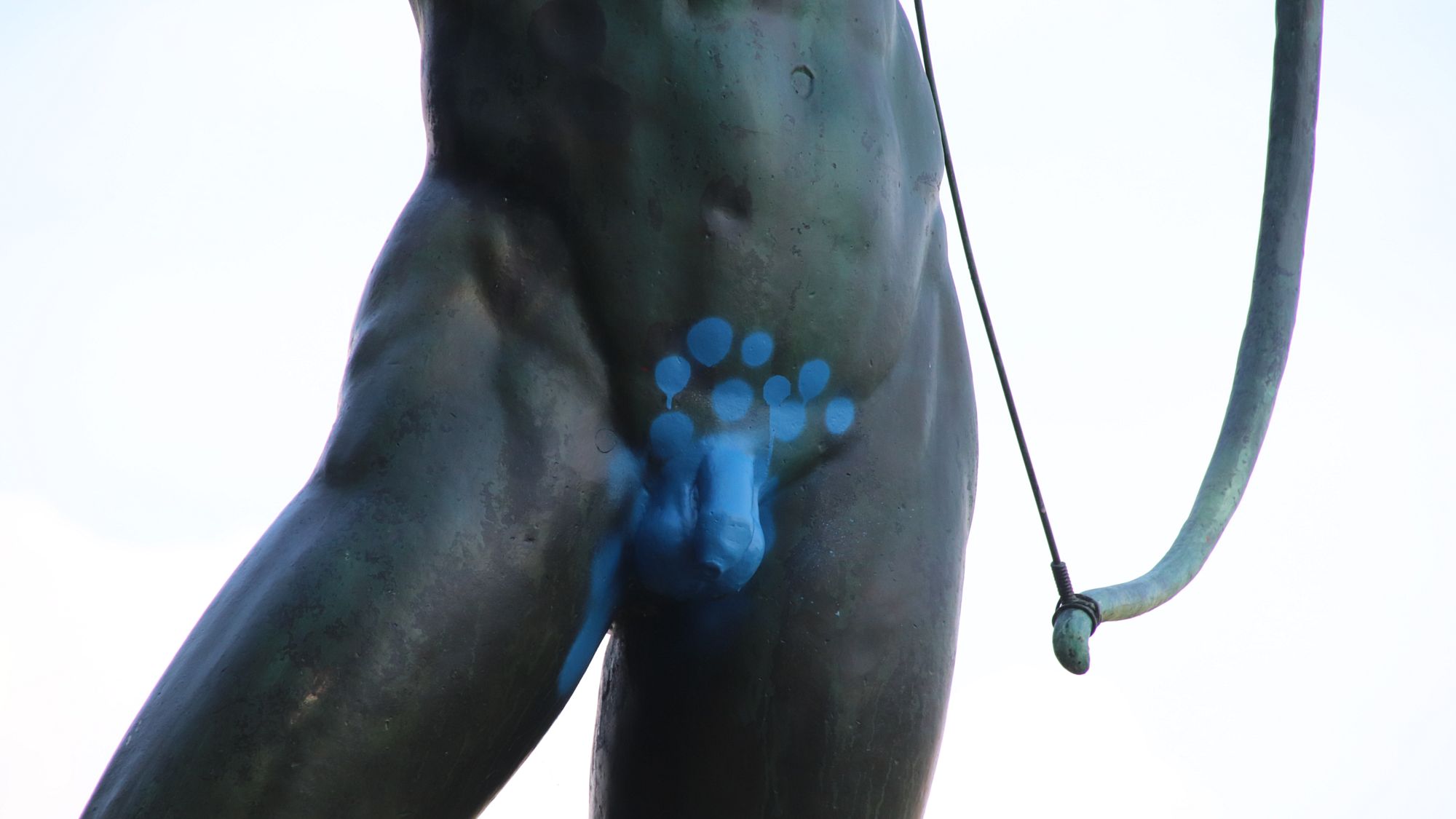 Es ist wohl in der Nacht zu Mittwoch geschehen. Eine bisher unbekannte Person kletterte den Sockel des Bogenschützen hinauf und lebte sich zwischen den Hartteilen des stattlichen und staatlichen Bronzekriegers aus. Nun schimmert der gesamte Lümmel samt Sack in hellblau. Schambehaarung wurde mittels blauer Punkte angedeutet. Ein fetter Tropfen Blau prangt am rechten Oberschenkel. Hier wurde liebevoll gespritzt für ein Denkmal in (wesentlich anderer) Bewegung.