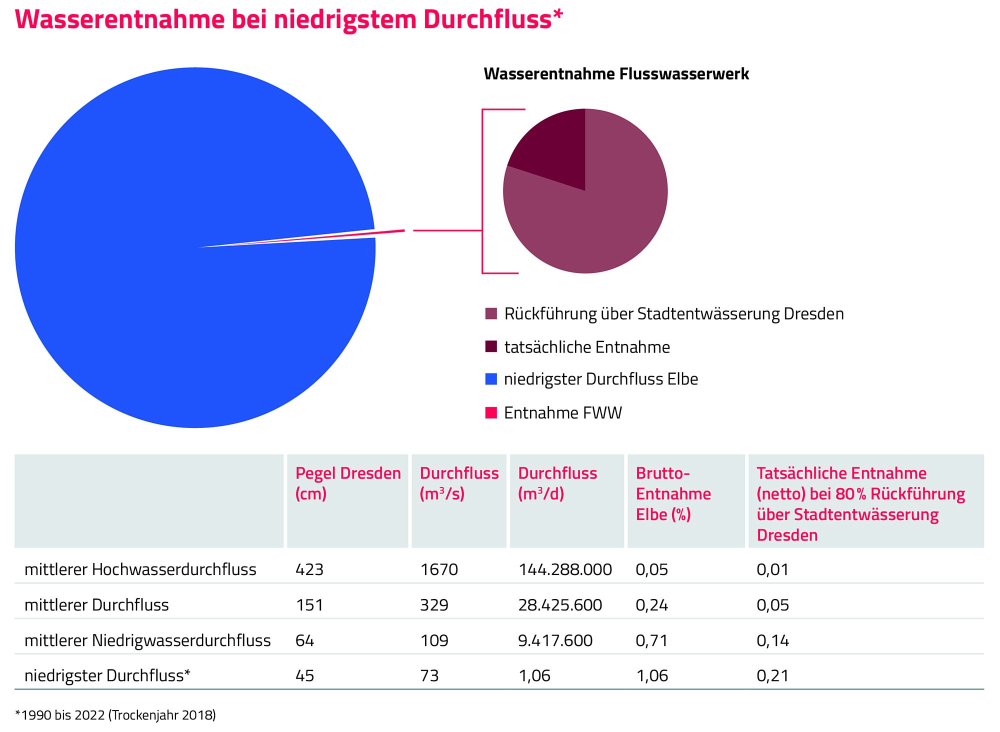 In der Pressemitteilung der Stadt Dresden steht es aber anders. Zitat: Die entnommene Menge liegt selbst in Zeiten von Niedrigwasser wegen der hohen Recycling-Quote bei lediglich 0,21 Prozent der Durchflussmenge und wird nach Nutzung zu 80 bis 90 Prozent über die Stadtentwässerung Dresden zurück in die Elbe geleitet.