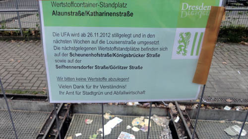 ob die leute wohl den neuen platz finden werden? am alten stapelts sich zum parkplatz hin erneut. bei fortgesetzt reger nutzung dieser UFAs (bauschild: die UFA wird stillgelegt, na so was) käme glatt die möglichkeit auf, infolge verpappung die zufahrt zum lehrerparkplatz zu unterbinden. nicht, das da noch ein neuer freiraum entsteht. allmorgendlich fluchende lehrer könnten schon bald die neustadt bereichern.